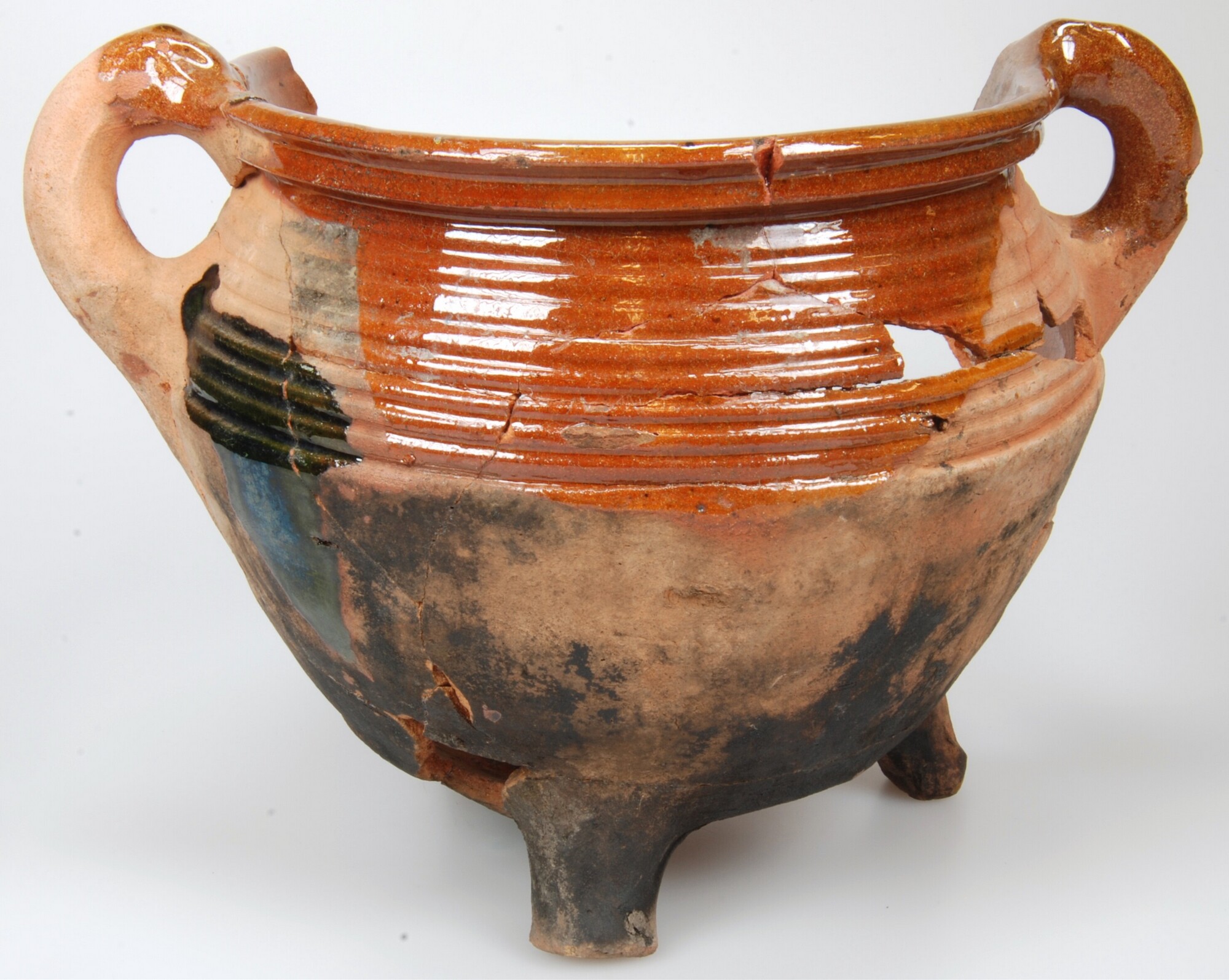 Grape; r-gra-34; roodbakkend; loodglazuur; grape met scherpe buikknik, ribbel op schouder en kraagrand met dekselgeul; drie poten; twee worstoren; datum: 29-11-2011