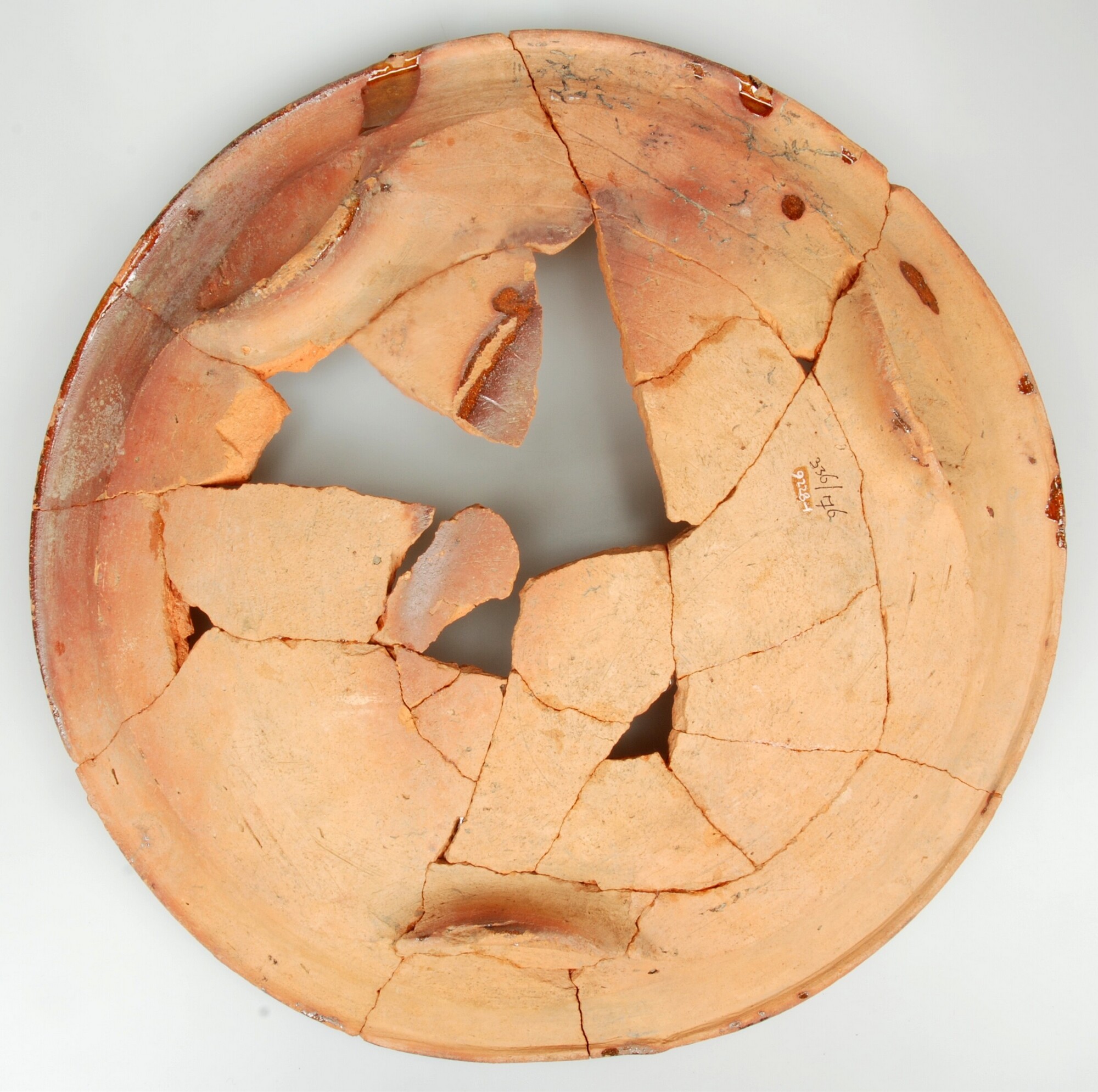 Bord; r-bor-6; roodbakkend; loodglazuur; groen/geel; slib; vlag: bladeren en stippen tussen concentrische cirkels; spiegel: kan tussen twee bladeren; drie standlobben; herkomst: Noord-Holland (Hoorn?); datum: 9-5-11; vondstomstandigheden: uit talud askuil