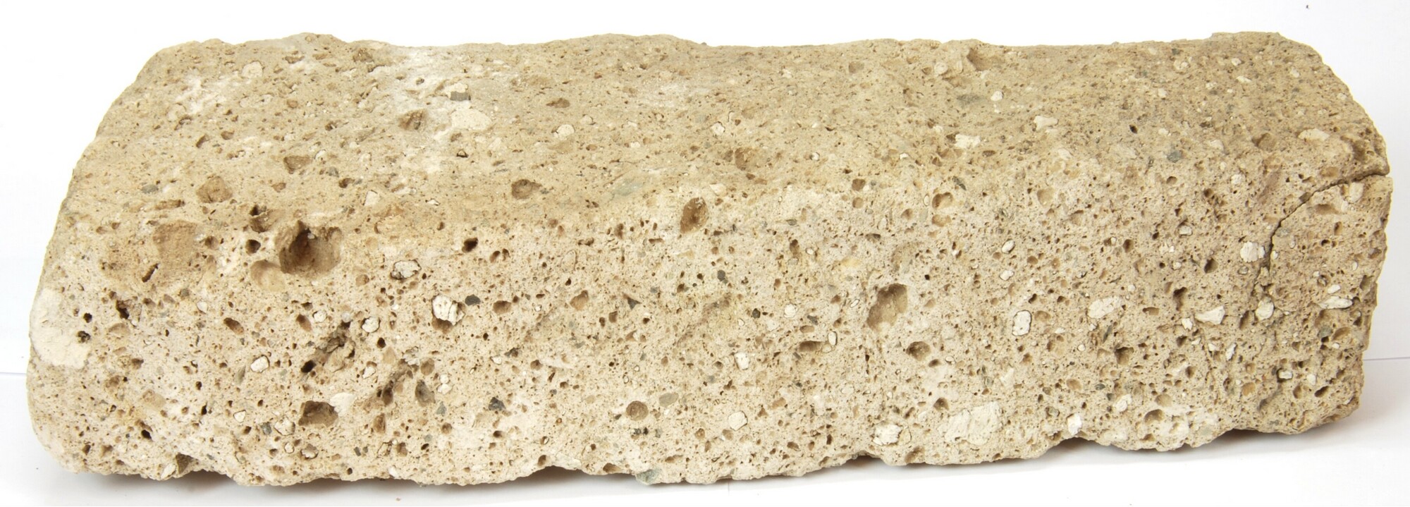 Bouwmateriaal; tufsteen; rechthoekig, taps toelopend blok; mogelijk onderdeel van een steenkist; herkomst: Eifel