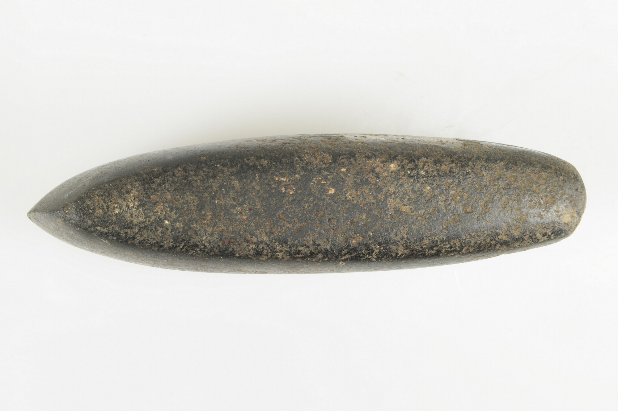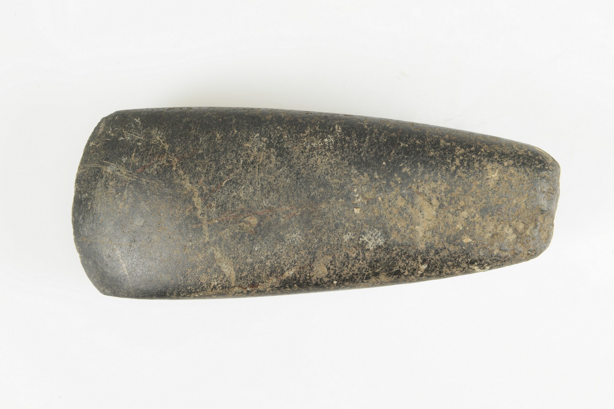 Bijl; type Fels-Rechteckbeil; geslepen met sporen van pecking?; snede is niet zeer scherp, omdat de bijl vrij dik is; vondstomstandigheden: Wieringermeer, kavel H 86