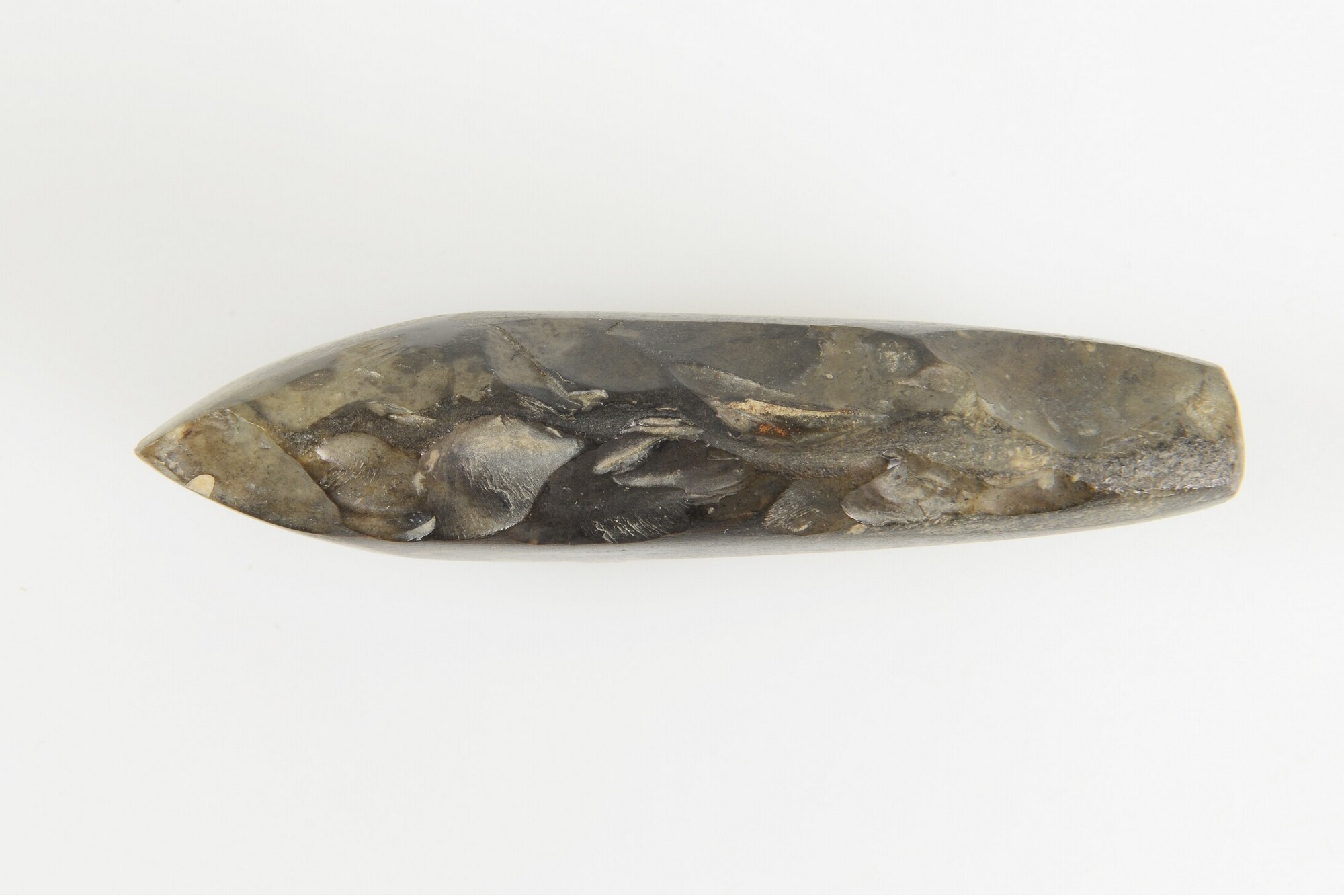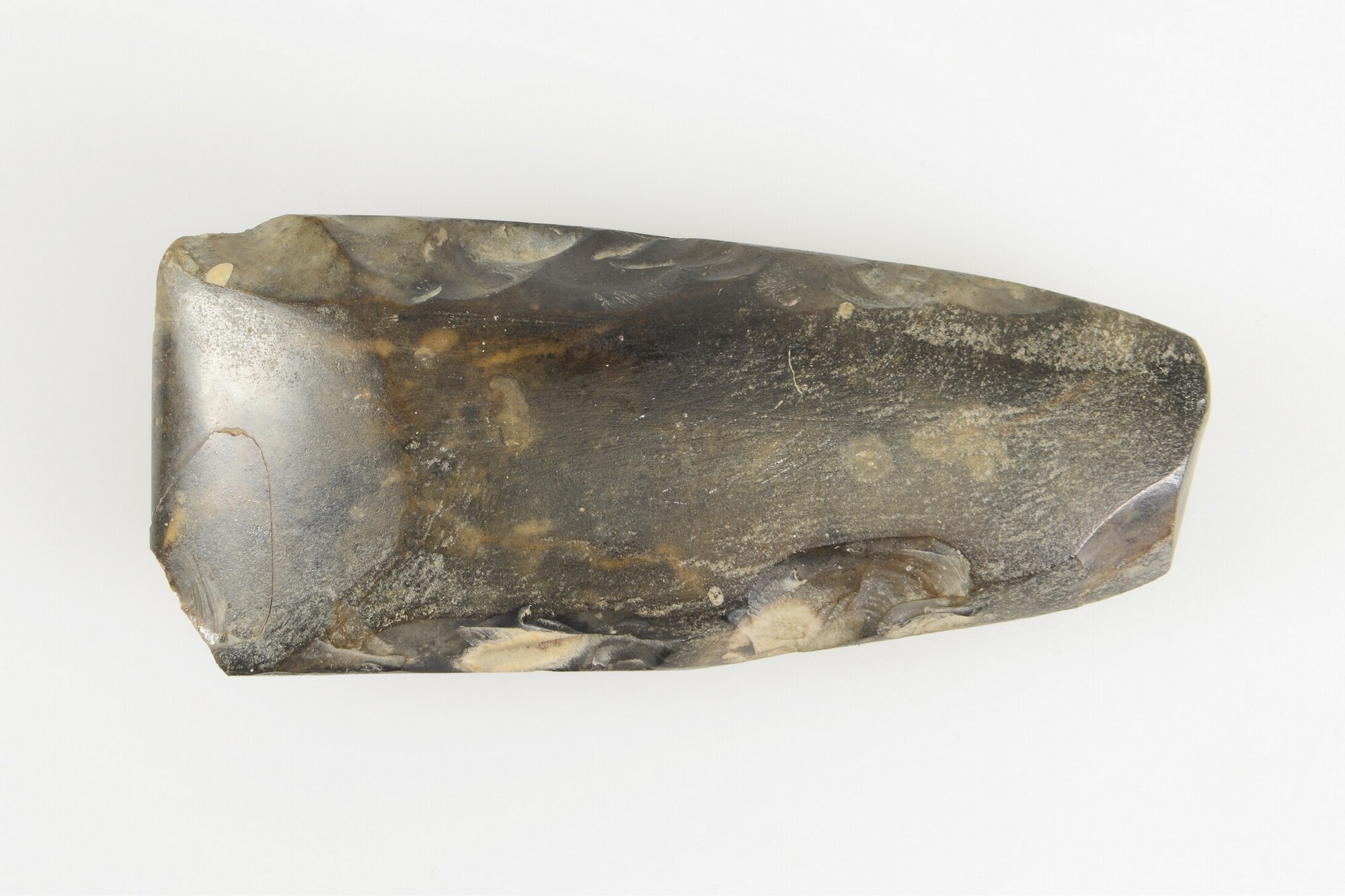 Bijl; type Flint-Ovalbeil; donkergrijze vuursteen met lichte vlekken; geslepen; zeer scherpe snede; brede, afgeknotte top; butsen aan de zijkanten; de snede is bijgeslepen; vondstomstandigheden: Wieringermeer, kavel H 42