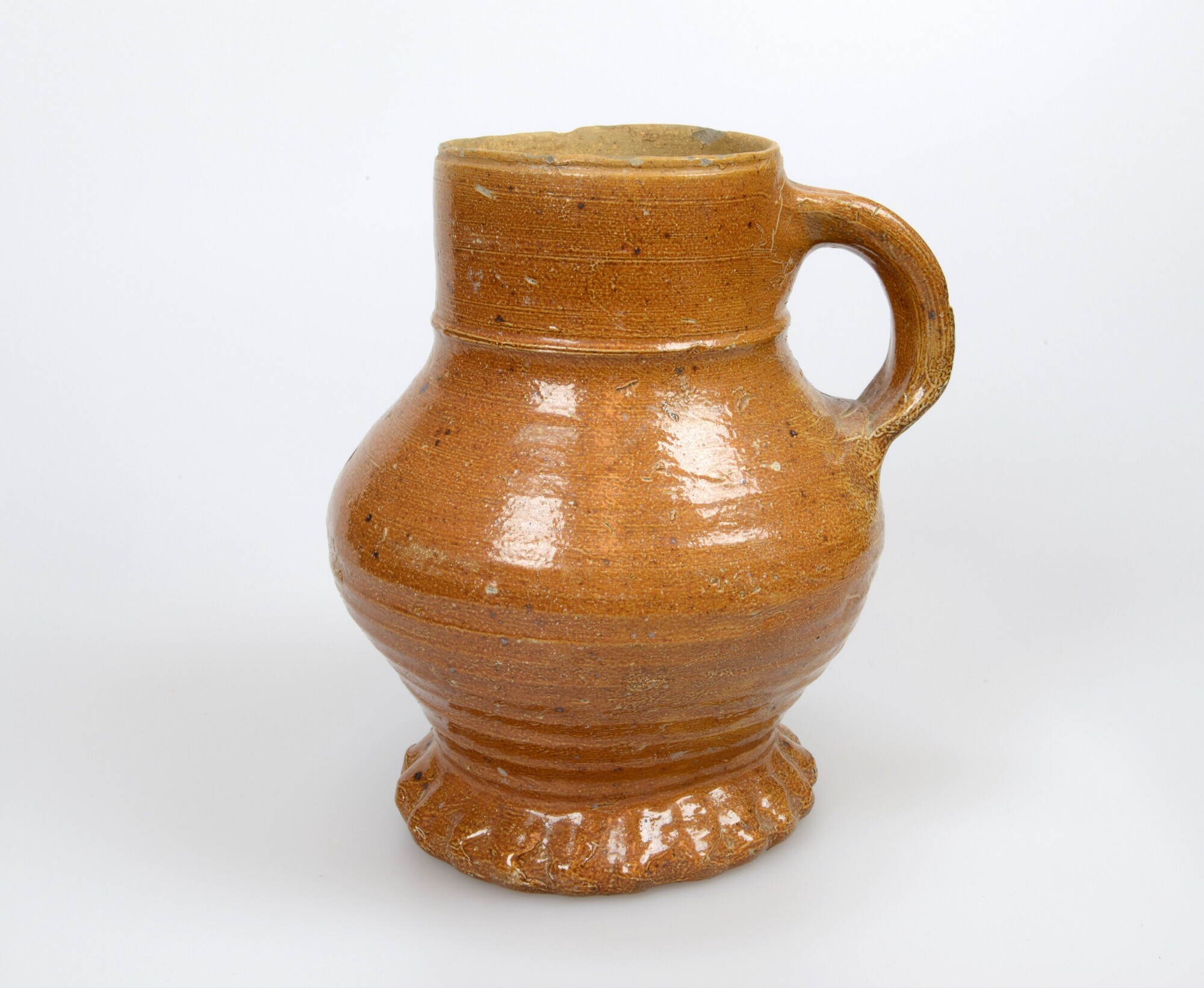 Kan; s2-kan-9; steengoed; zoutglazuur; bolle drinkkan met hoge schouder en cilindrische hals, ribbel op halsaanzet; verticaal lintoor; toegeknepen standring; herkomst: Raeren; vinder: H. de Boer, opgevist uit haven van Monnickendam