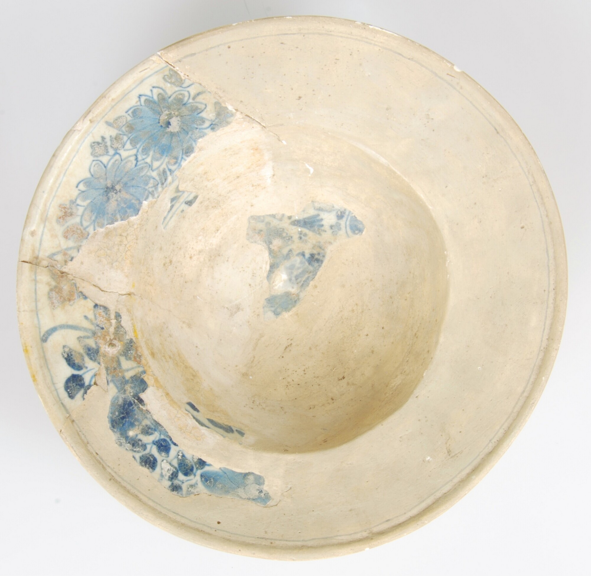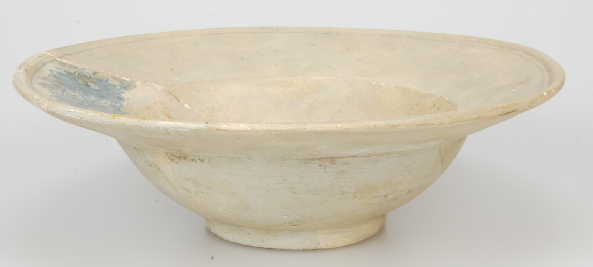 Bord; f-bor-?; diep hol bord met brede vlag; standring; blauw op wit; spiegel en vlag: bloemmotieven; Wieringermeer, Slootdorp, 1952 nr 2