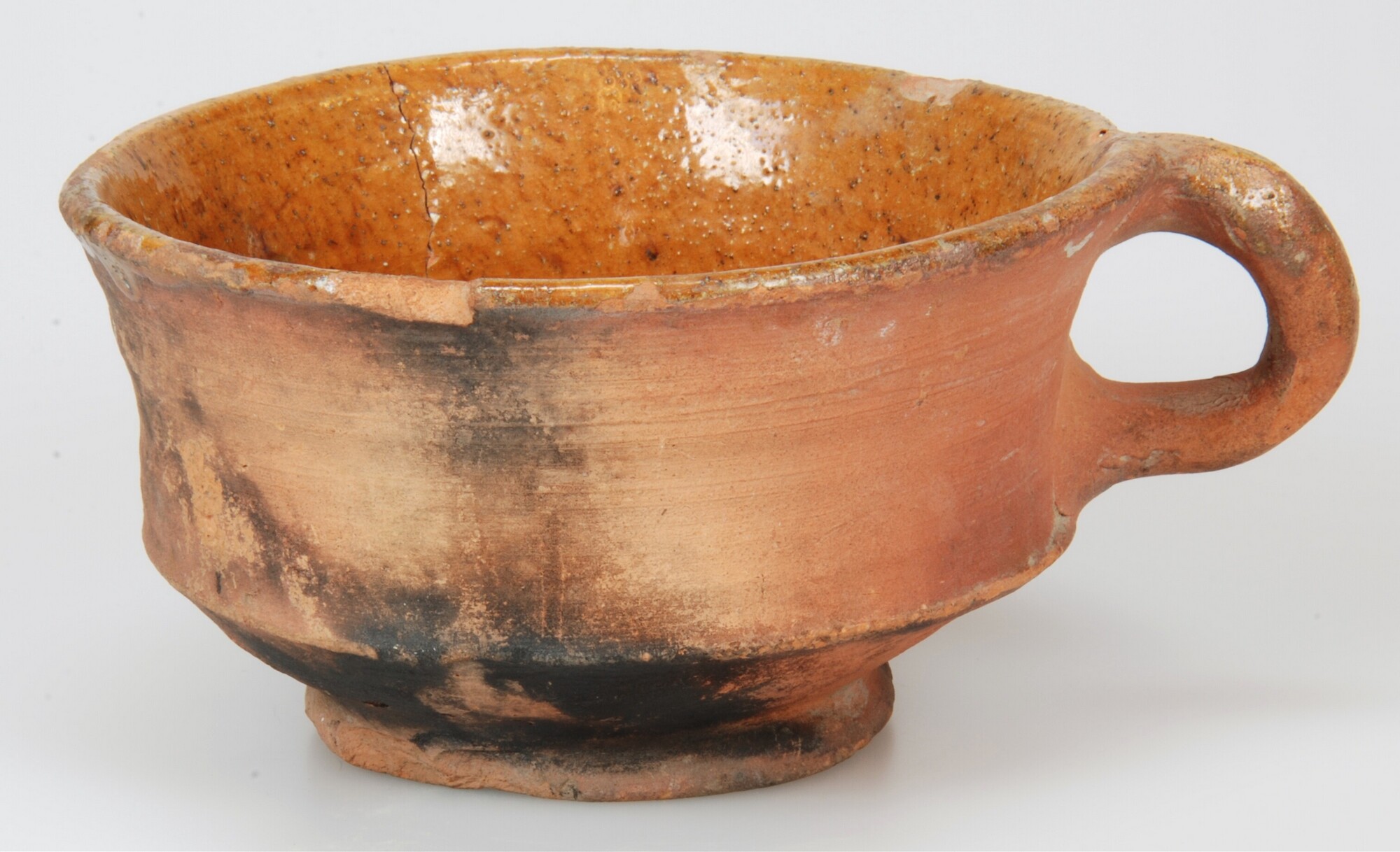 Kop; r-kop-41; roodbakkend; loodglazuur; diepe kop met knik bodem-wand, iets uitgebogen wand met kleine kraagrand; standring; Wieringermeer, vindplaats onbekend