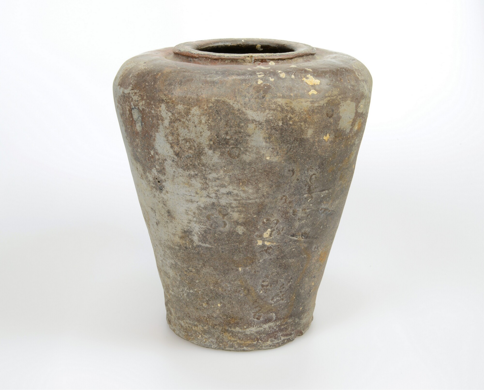 Martavaan; s7-pot-2; hoge, conische pot met ronde, naar binnen gebogen schouder en scherp geknikte, opstaande en aan bovenzijde verdikte, afgeronde rand, standvlak; Aziatisch steengoed; ijzerengobe, zoutglazuur; herkomst: Zuidoost-Azië