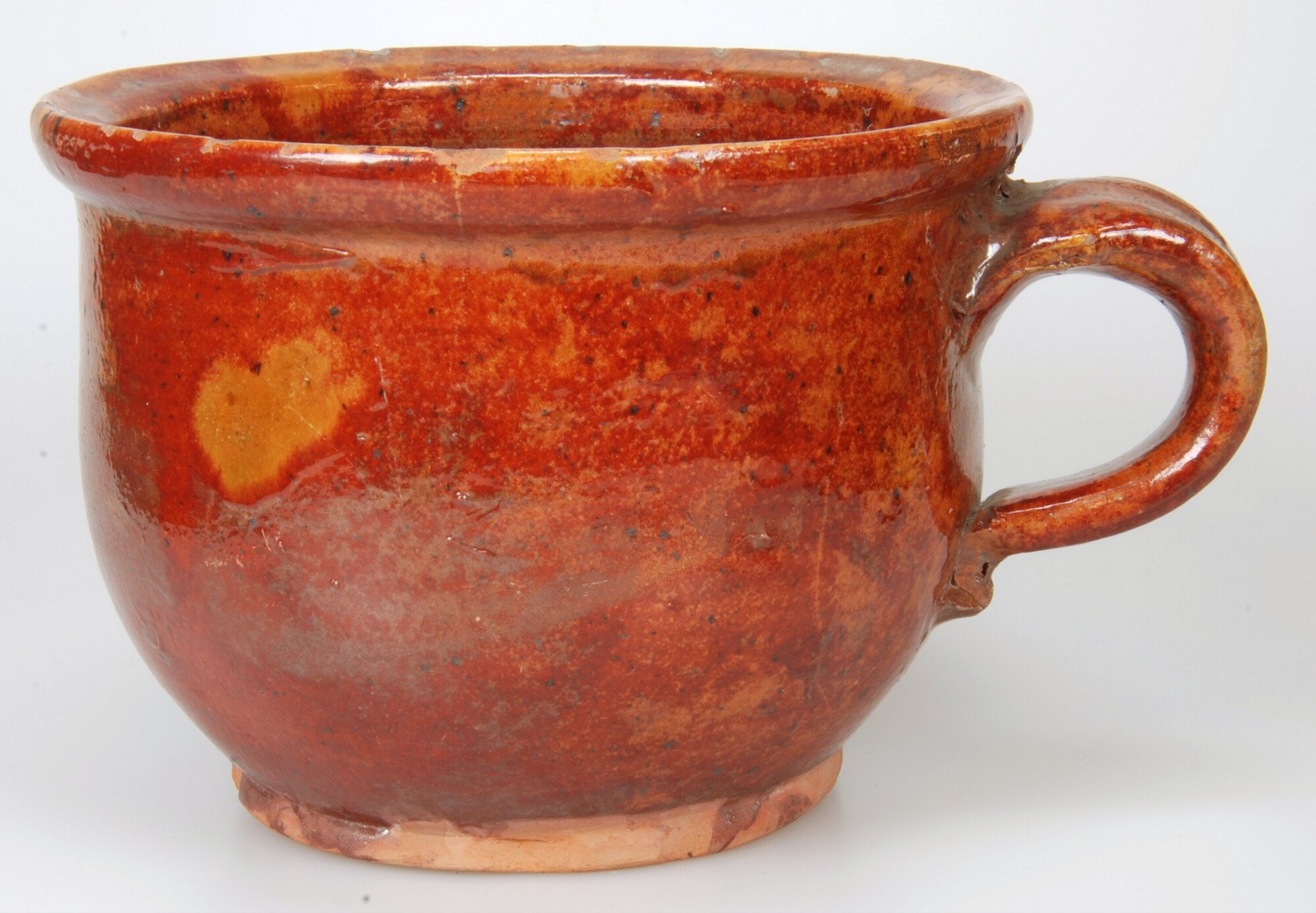 Pispot; r-pis-?; roodbakkend; loodglazuur; pispot met steile wand en naar buiten geknikte afgeronde rand; standvlak; Wieringermeer, vindplaats onbekend