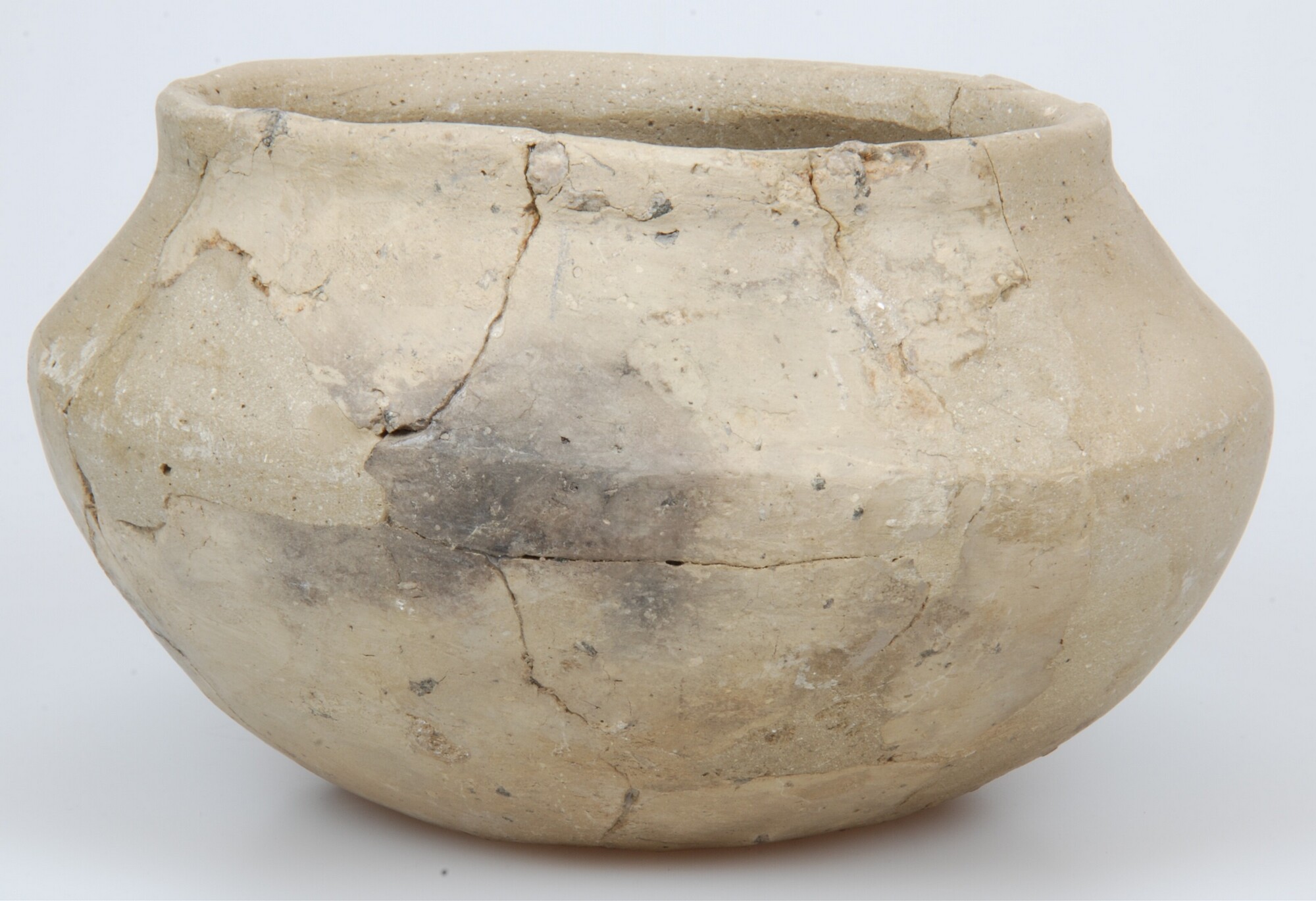 Dubbelconische pot; Hoogkarspel-Jong aardewerk; granietmagering; baksel DD, lichtbruin tot donkergrijs; buikknik overlopend in lange hals en opstaande rand; standvlak; buitenzijde gepolijst en binnenzijde geglad