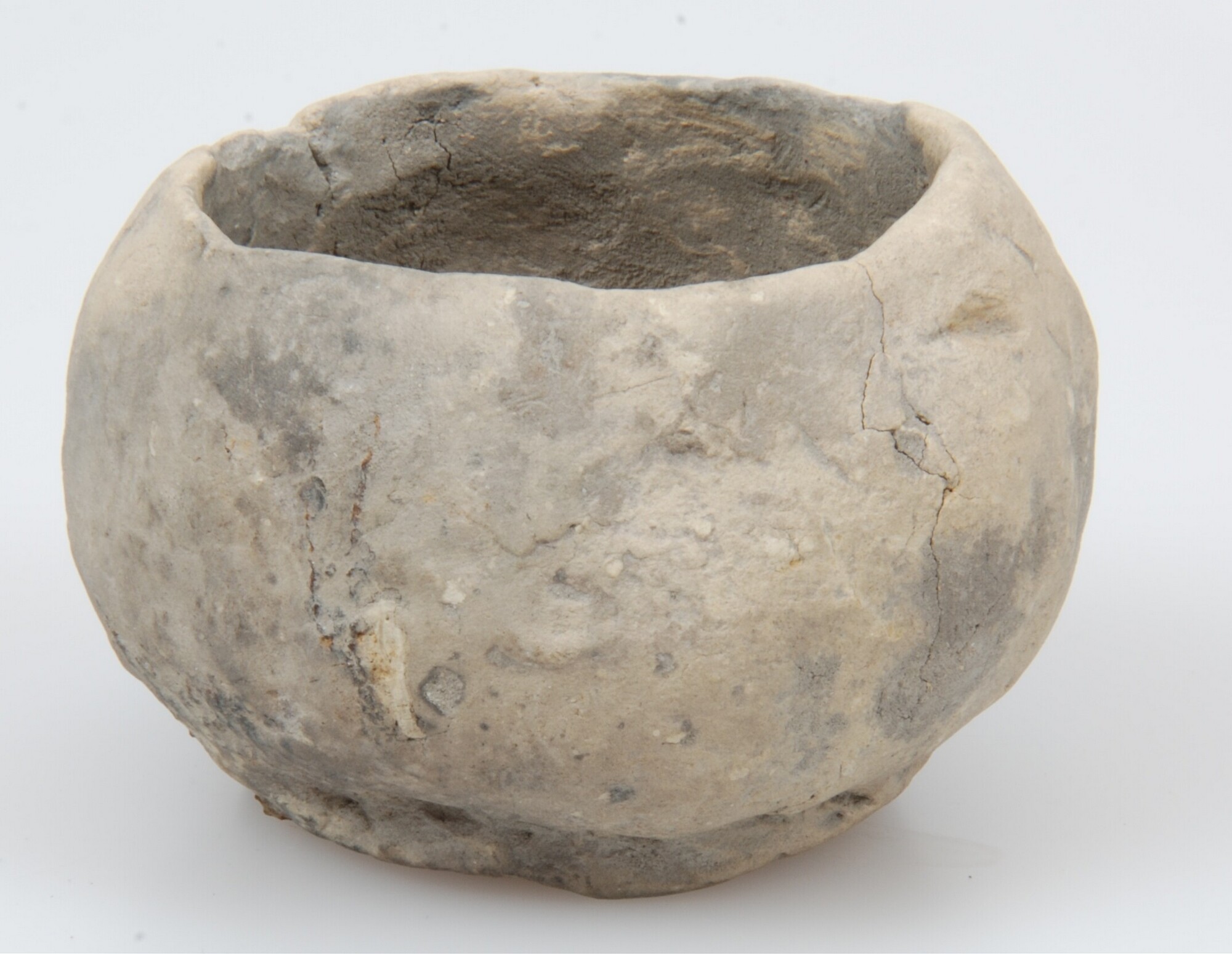 Miniatuur-pot; Hoogkarspel-Jong aardewerk; steengruismagering; baksel DD, lichtbruin tot lichtgrijs; afwerking: geglad; standring; vondstomstandigheden: oostelijk deel put 97