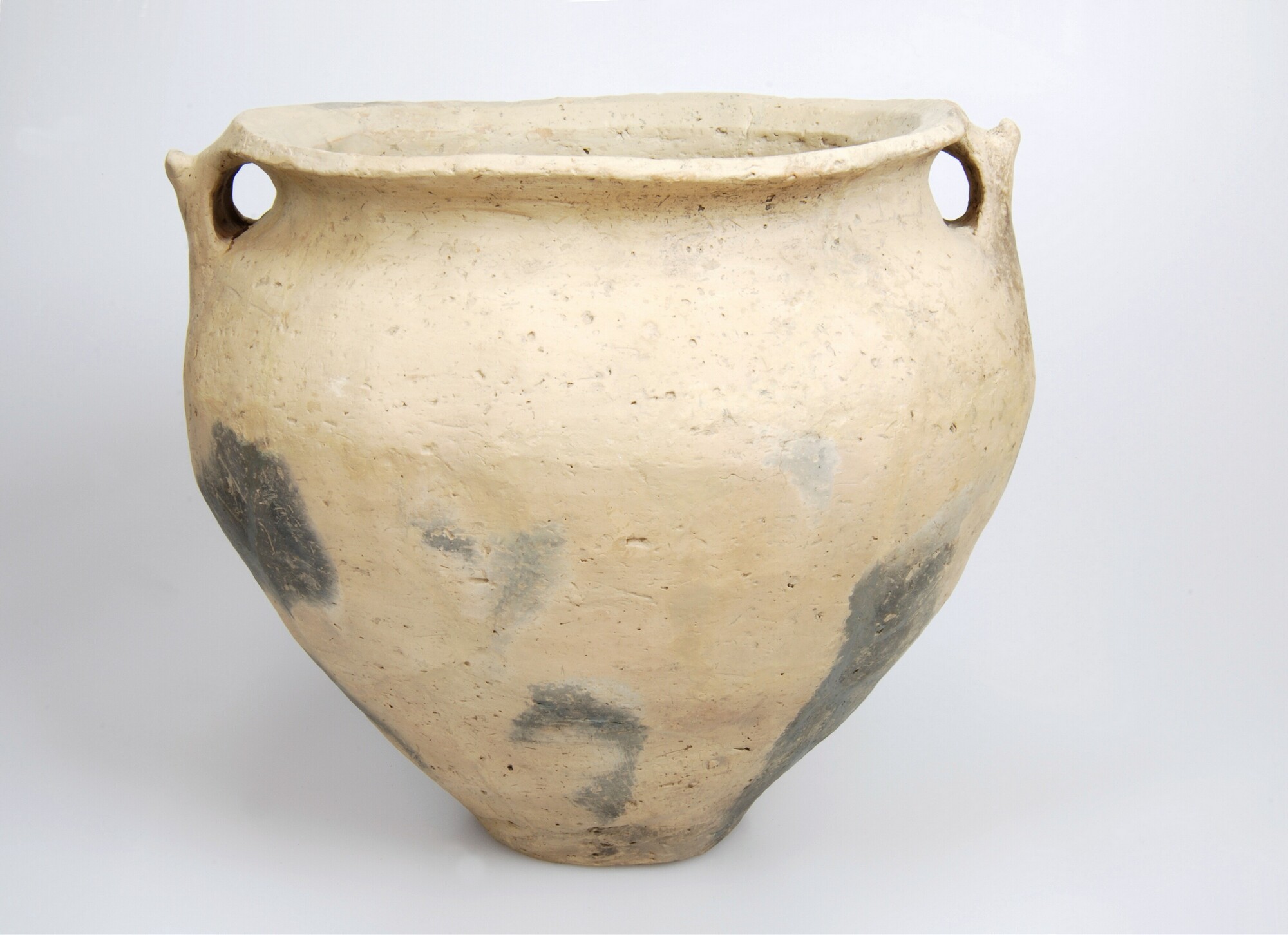 Pot; type Diederik F-II; inheems-romeins aardewerk; wijdmondige lage pot met twee oren aan de rand; standvlak; organische magering; oppervlak geglad