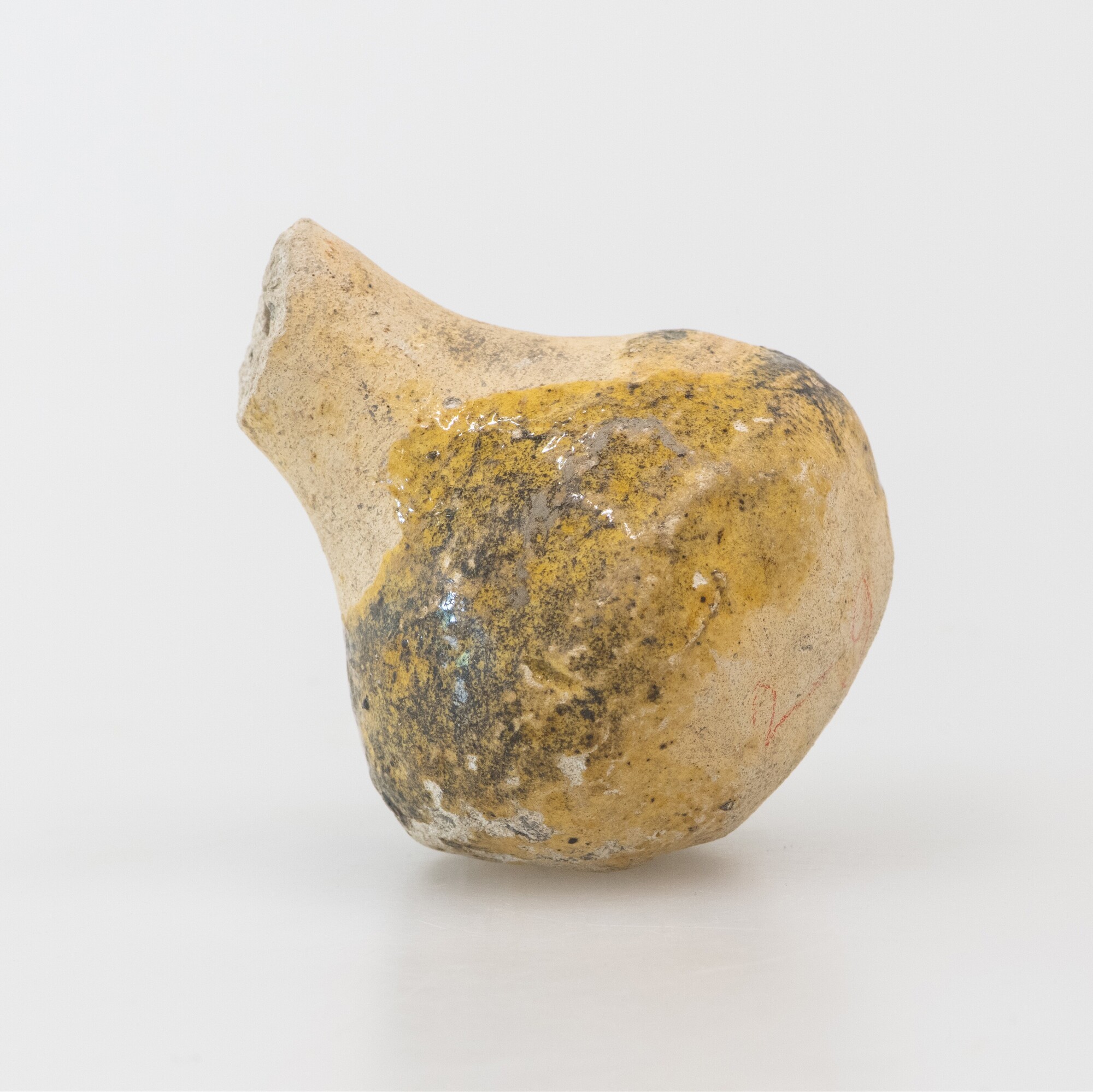 Rammelaar; Maasvallei (Andenne-)aardewerk; regelmatige bolvorm met een steel waarvan het uiteinde is afgebroken. Bovenaan is er een kleine gleuf die zorgt voor een betere klank; spaarzaam geel/groenglazuur op de buitenzijde