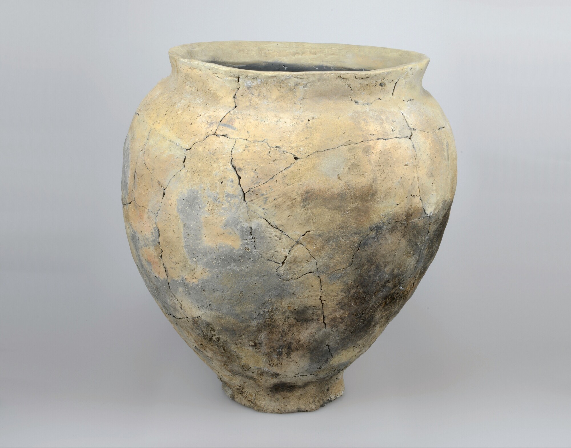 Pot; type Diederik FI-b; inheems-romeins aardewerk; zeer groot formaat nauwmondige pot met besmeten onderwand en vingertopversiering; standvlak; potgruis magering; potnr.: 223-3; vondstgegevens: 4255