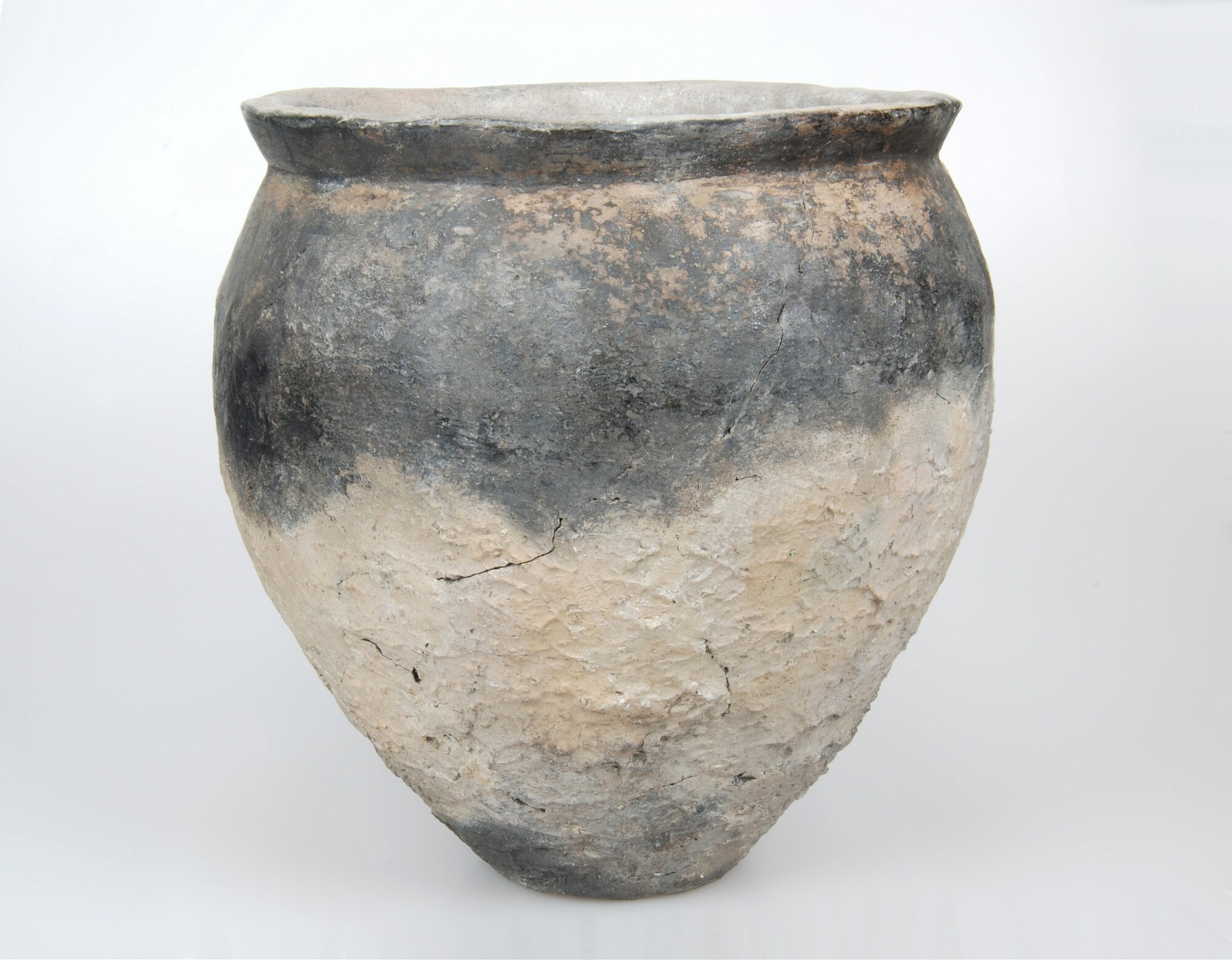 Kookpot; type Diederik F-Ib; inheems-romeins aardewerk; wijdmondige kookpot met schuine rand en relatief hoog geplaatste schouder, besmeten onderwand en gegladde bovenwand; standvlak