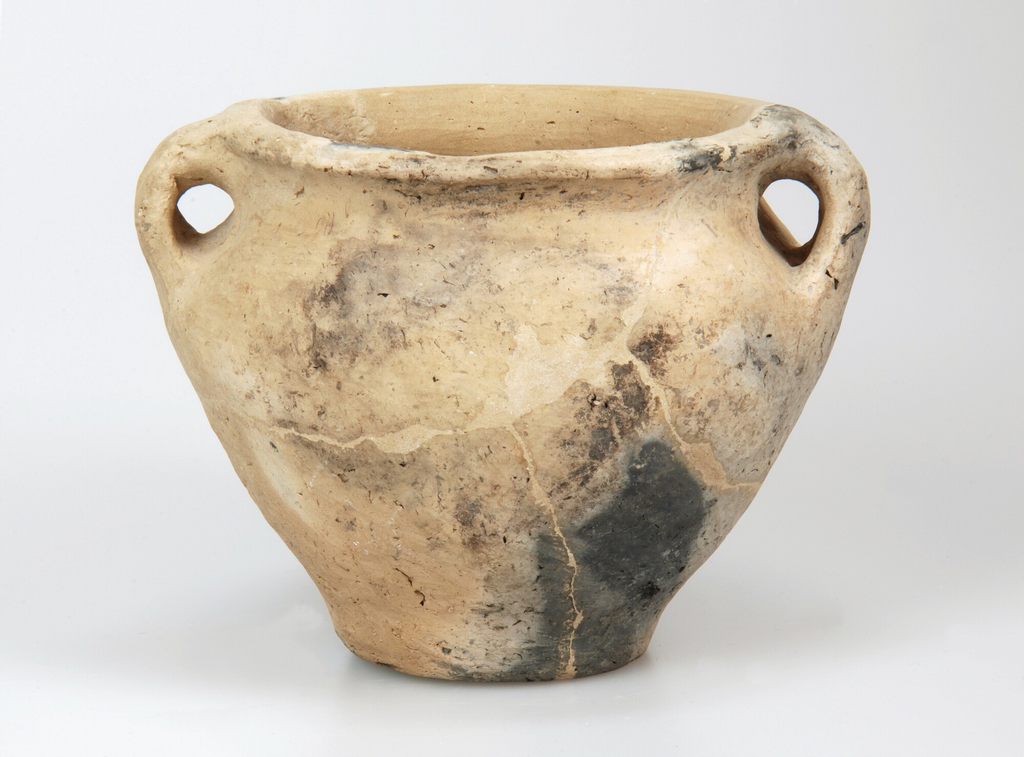 Pot; type Diederik F-II/ F-III; inheems-romeins aardewerk; bolvormige pot met twee oren aan de C-rand en gegladde wand; standvlak; organische magering