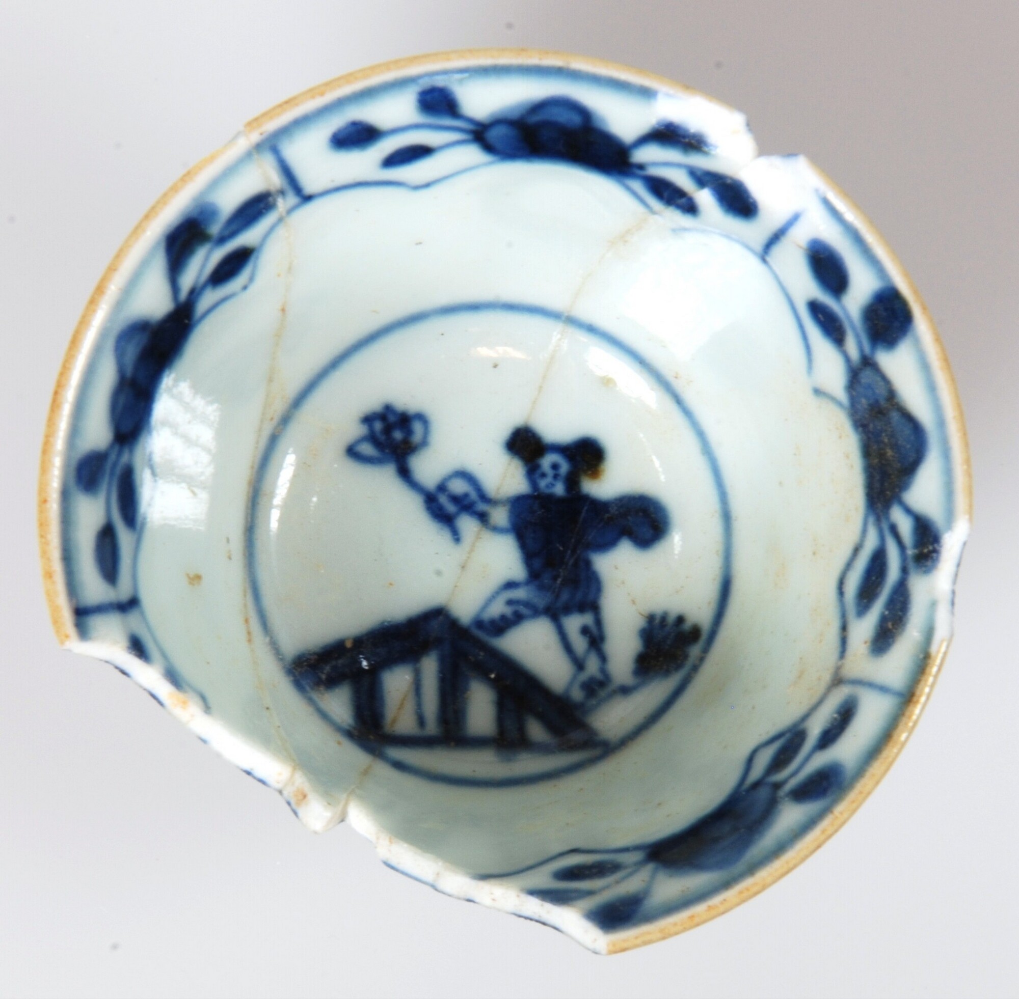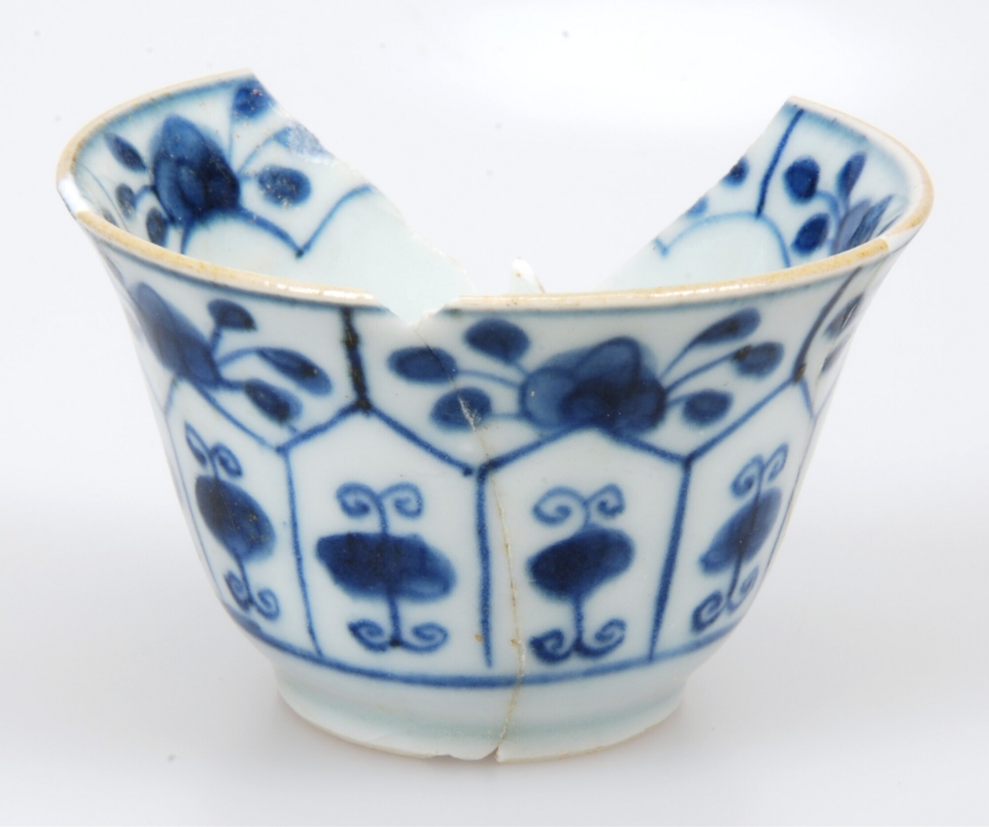 Kop; p-kop-1; porselein; veldspaatglazuur/kobaltoxide; onderglazuur blauw/bruingeel: uitwendig: vakverdeling met bloemen; inwendig: Chinees met bloem in landschap, vak verdeling met bloemen onder rand; 'zeemleer' op rand; standring; archeologisch compleet; herkomst: China