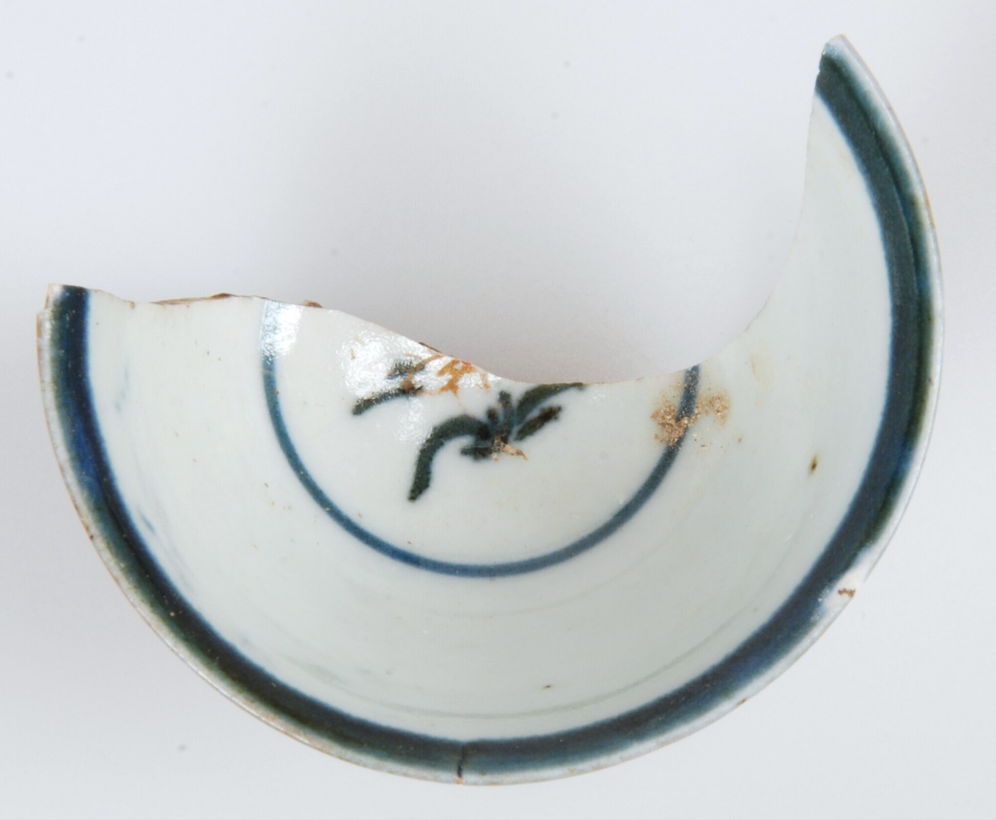 Kop; p-kop-1; porselein; veldspaatglazuur/kobaltoxide; onderglazuur blauw/bovenglazuur goud/rood: in- en uitwendig bloemen; standring; profiel compleet; herkomst: Japan