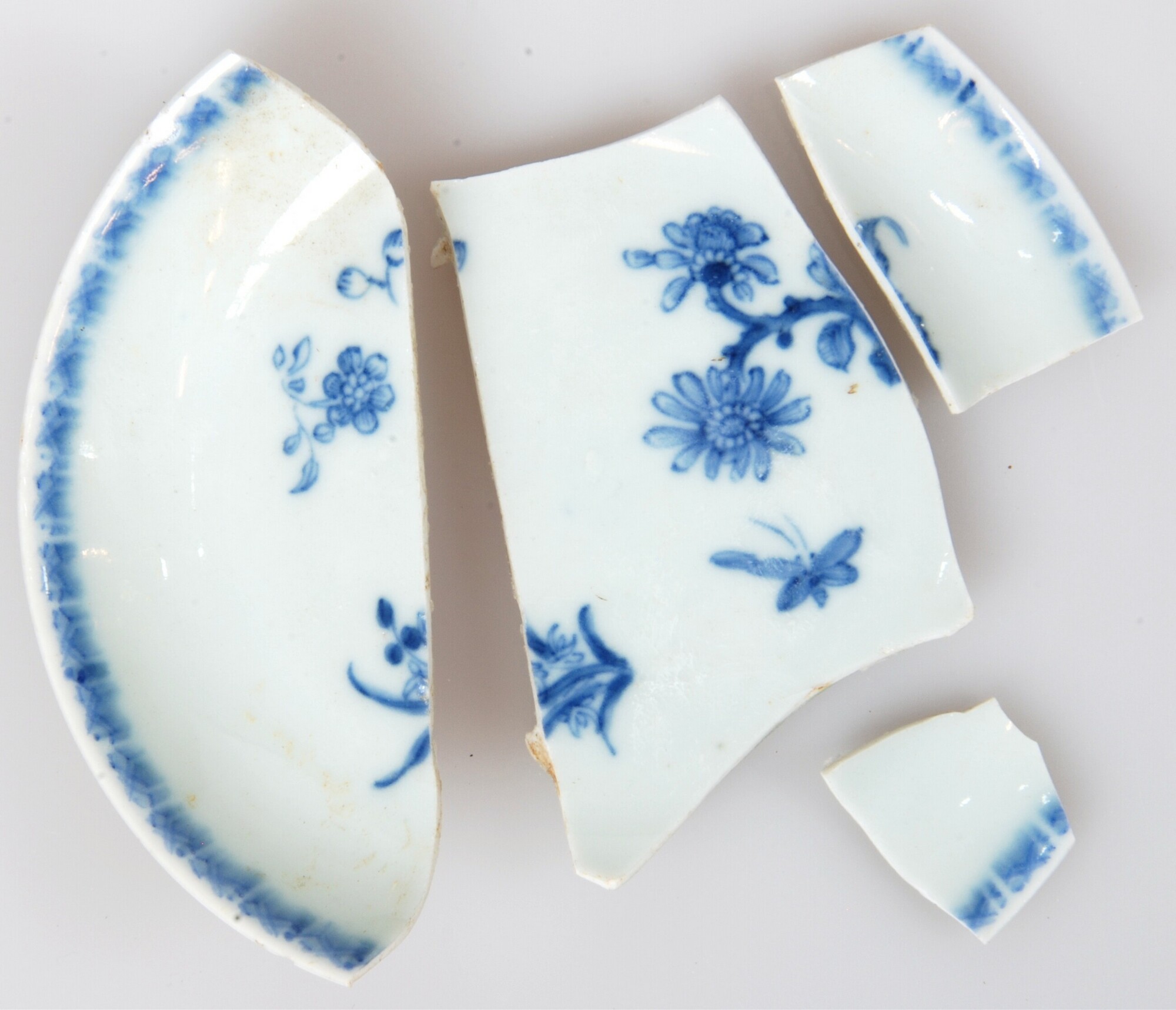 Schotel; p-bor-1; porselein; veldspaatglazuur/kobaltoxide; onderglazuur blauw: bloemen en vlinders, servetwerk op rand; standring; archeologisch compleet; herkomst: China; bestaat uit 4 bij elkaar behorende fragmenten