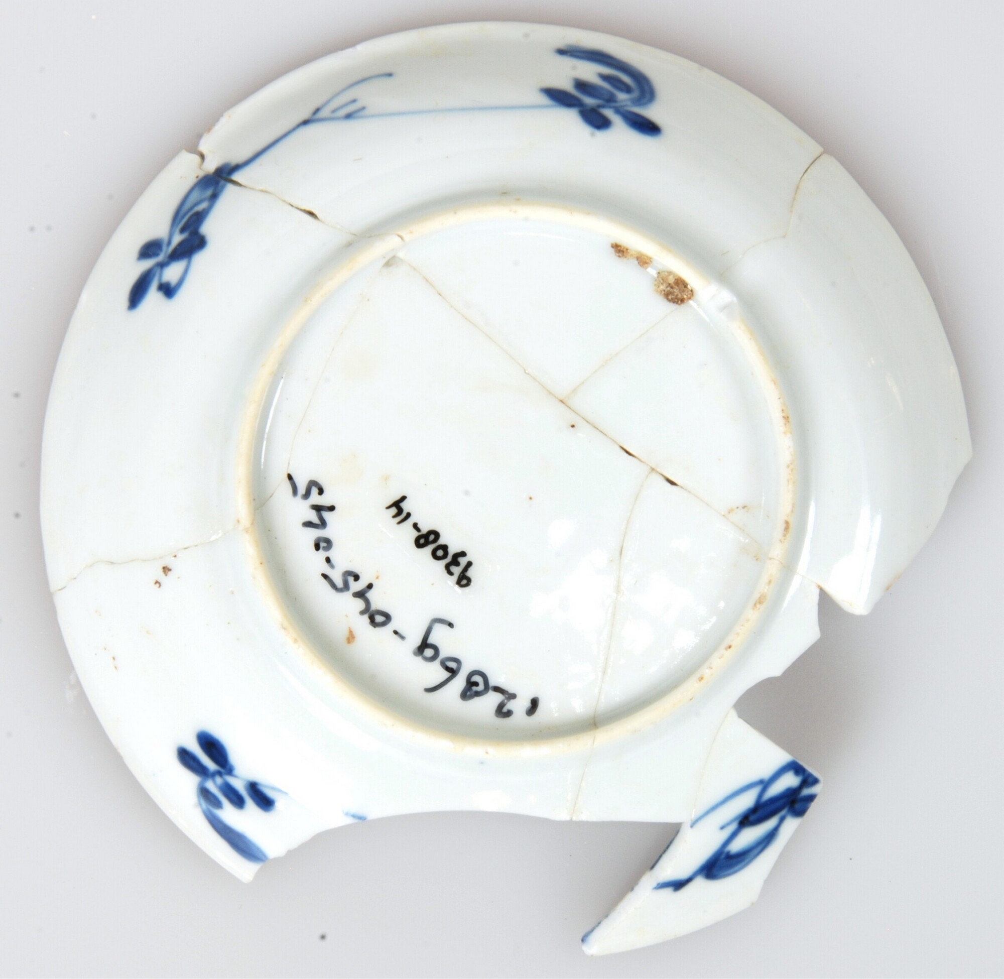 Schotel; p-bor-1; porselein; veldspaatglazuur/kobaltoxide; onderglazuur blauw; spiegel: cartouches met landschapjes en bloemen, centrale roos, ranken op onderzijde; standring; archeologisch compleet; herkomst: China