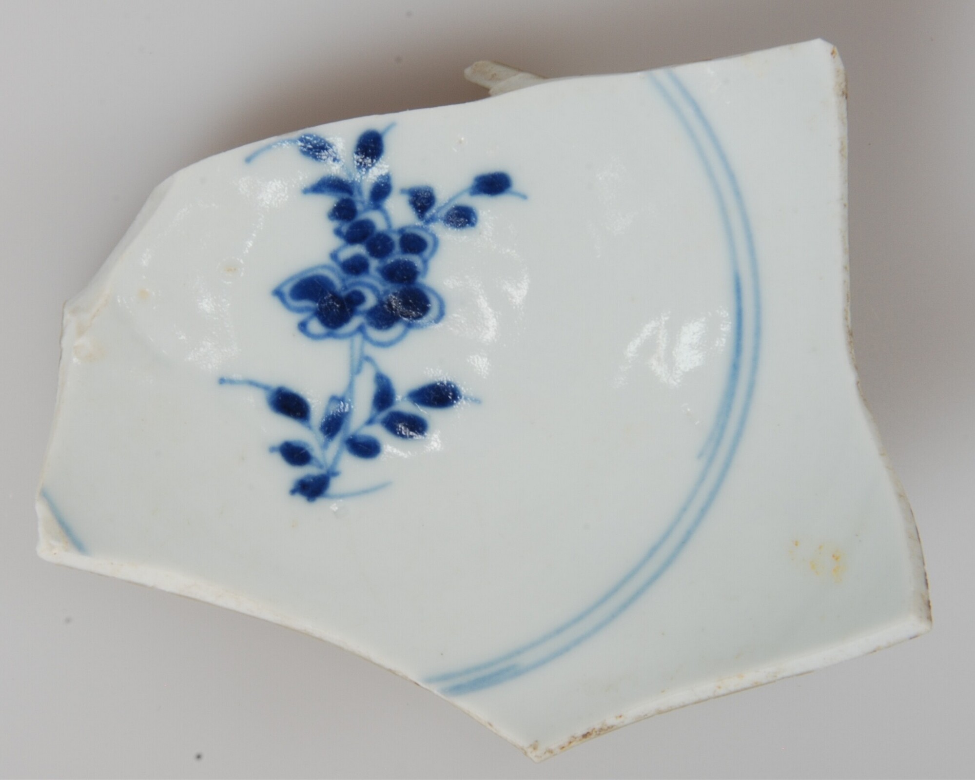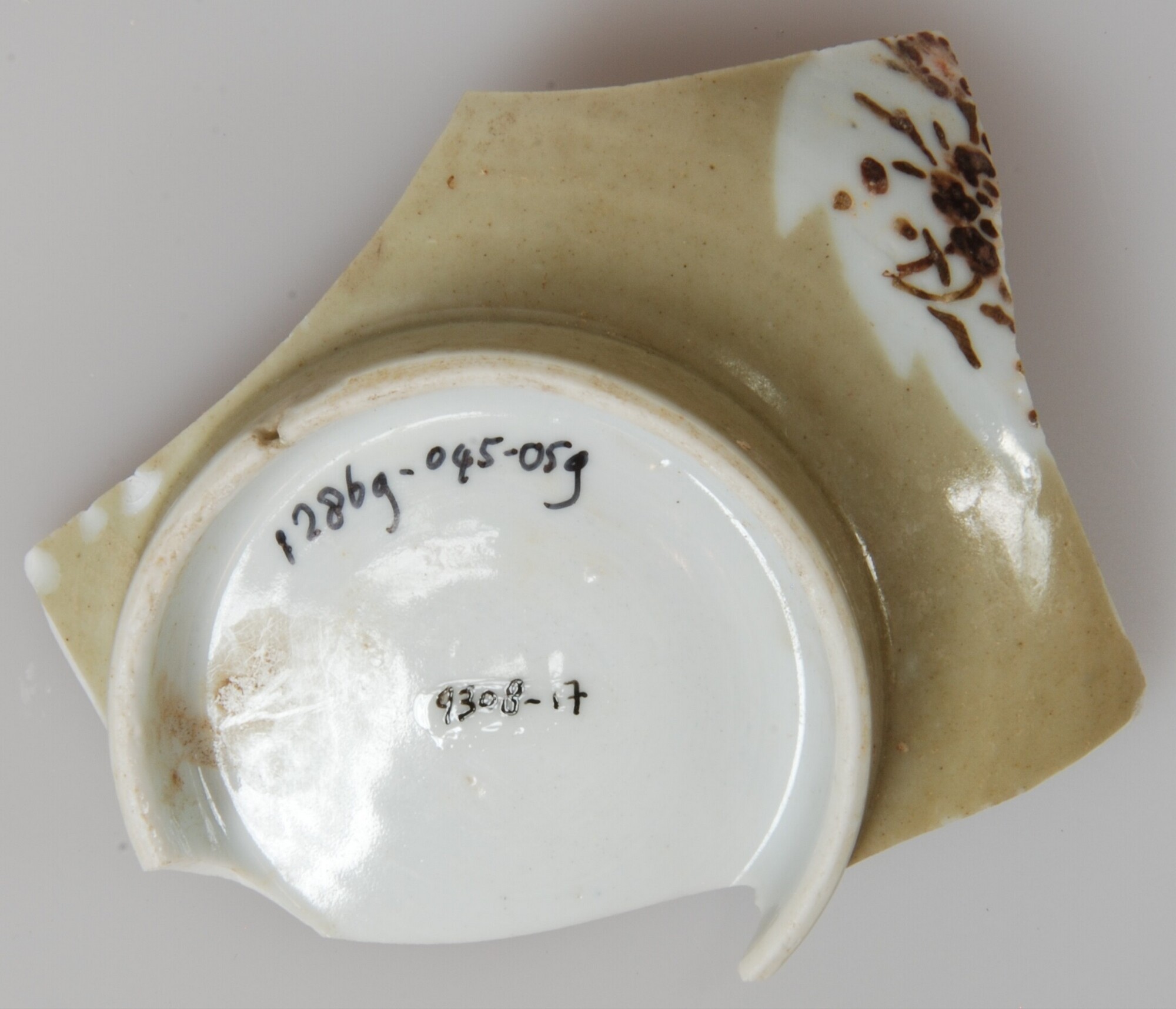 Kom; p-kom; porselein; veldspaatglazuur/kobaltoxide; onderglazuur blauw/grijs-groen, inwendig: blauwe bloem binnen dubbele cirkel, uitwendig: grijsgroen oppervlak, opengewerkte cartouche met bovenglazuur bruin/ rode bloem; standring; bodemfragment; herkomst: China