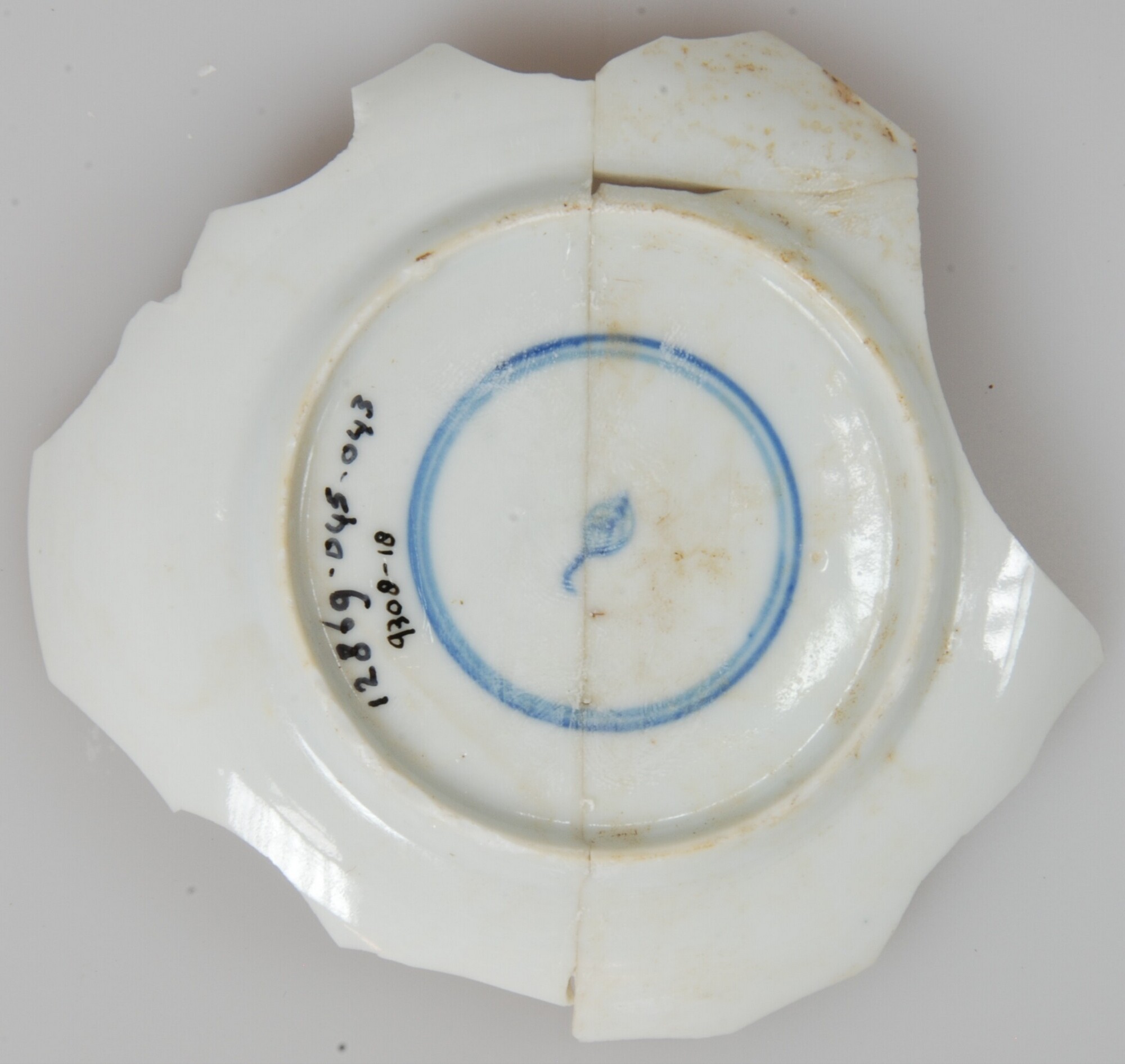 Schotel; p-bor-6; porselein; veldspaatglazuur/kobaltoxide; onderglazuur blauw/geelbruin: onderglazuur blauw op wit: 5 karpers; onderzijde: dubbele cirkel met blad; standring; profiel compleet (vormt setje met p-kop-1); herkomst: China