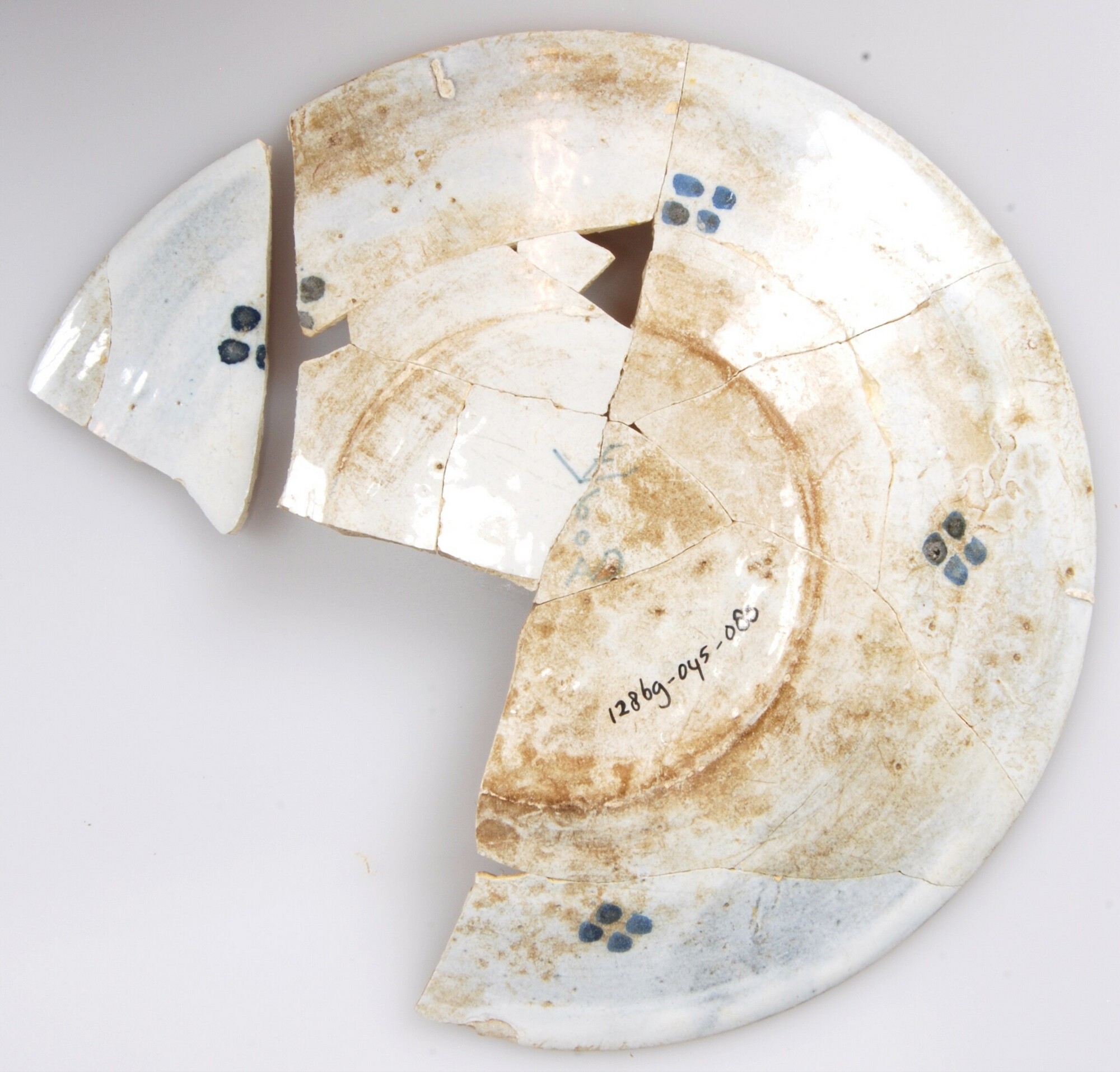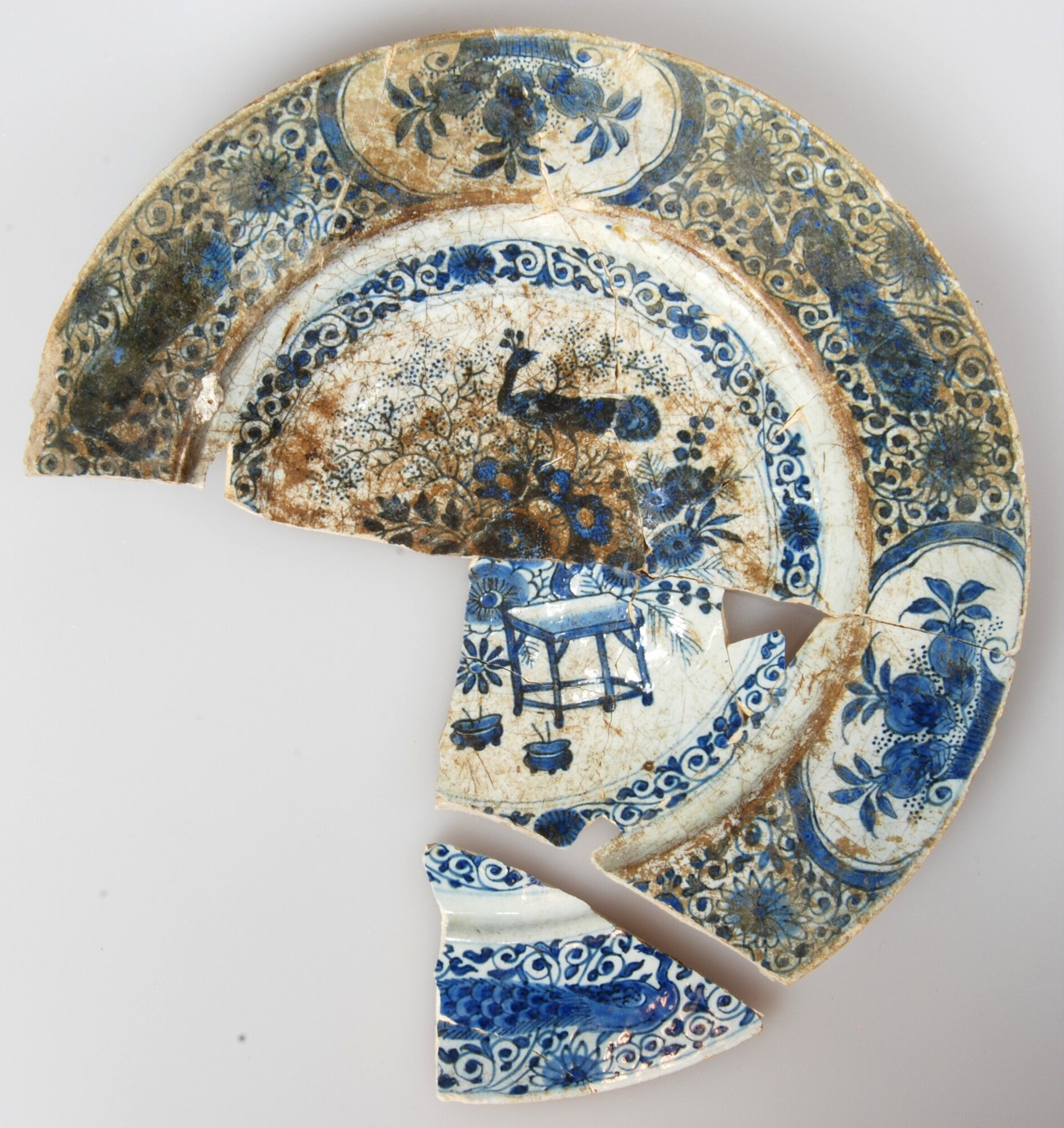 Bord; f-bor-2; faience; tinglazuur; blauw op wit: pauw in Chinese tuin, onderzijde gemerkt: VE (monogram) 60 AD; standvlak; archeologisch compleet; herkomst: Nederland; 1 losse bijbehorende randscherf