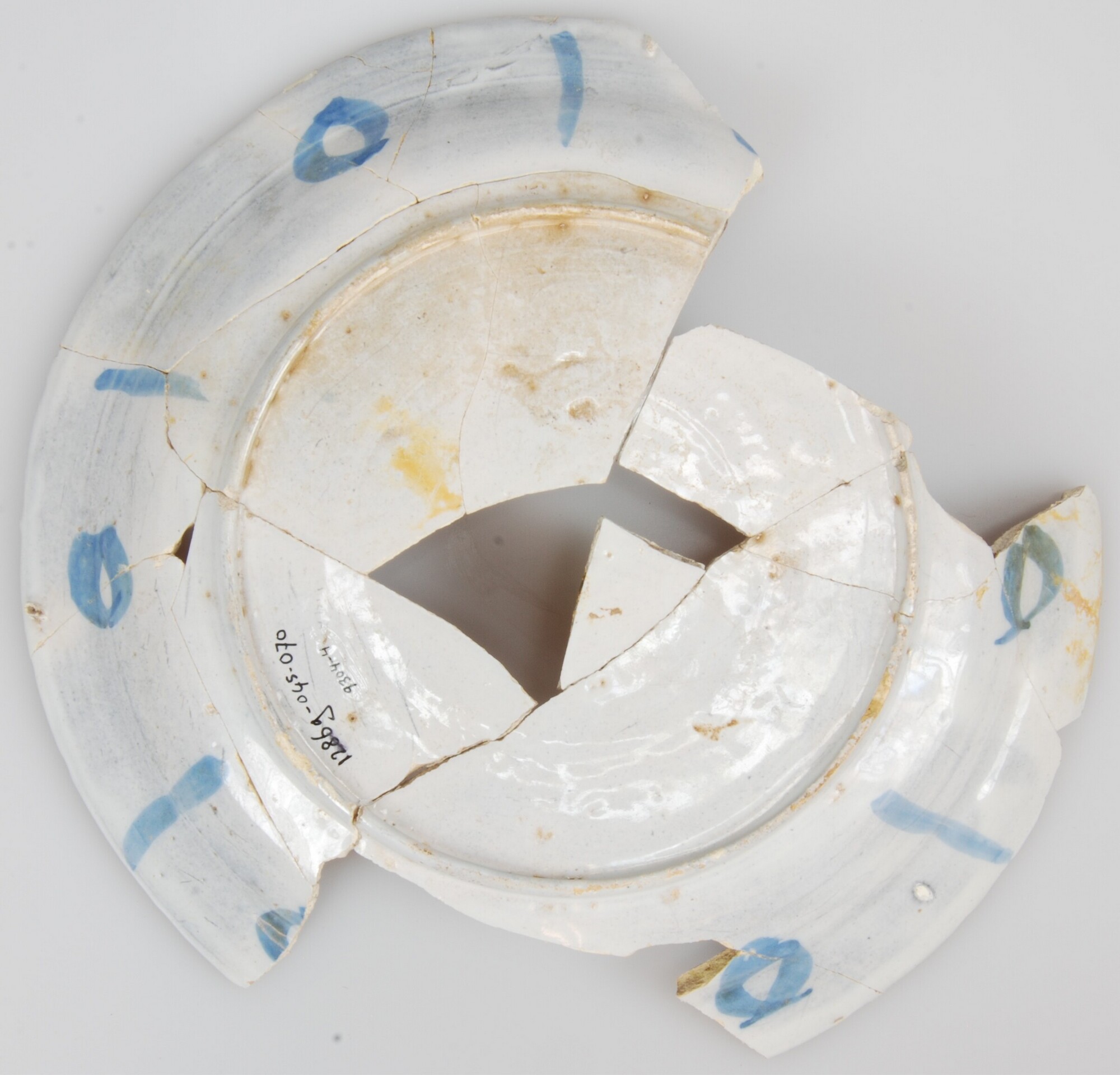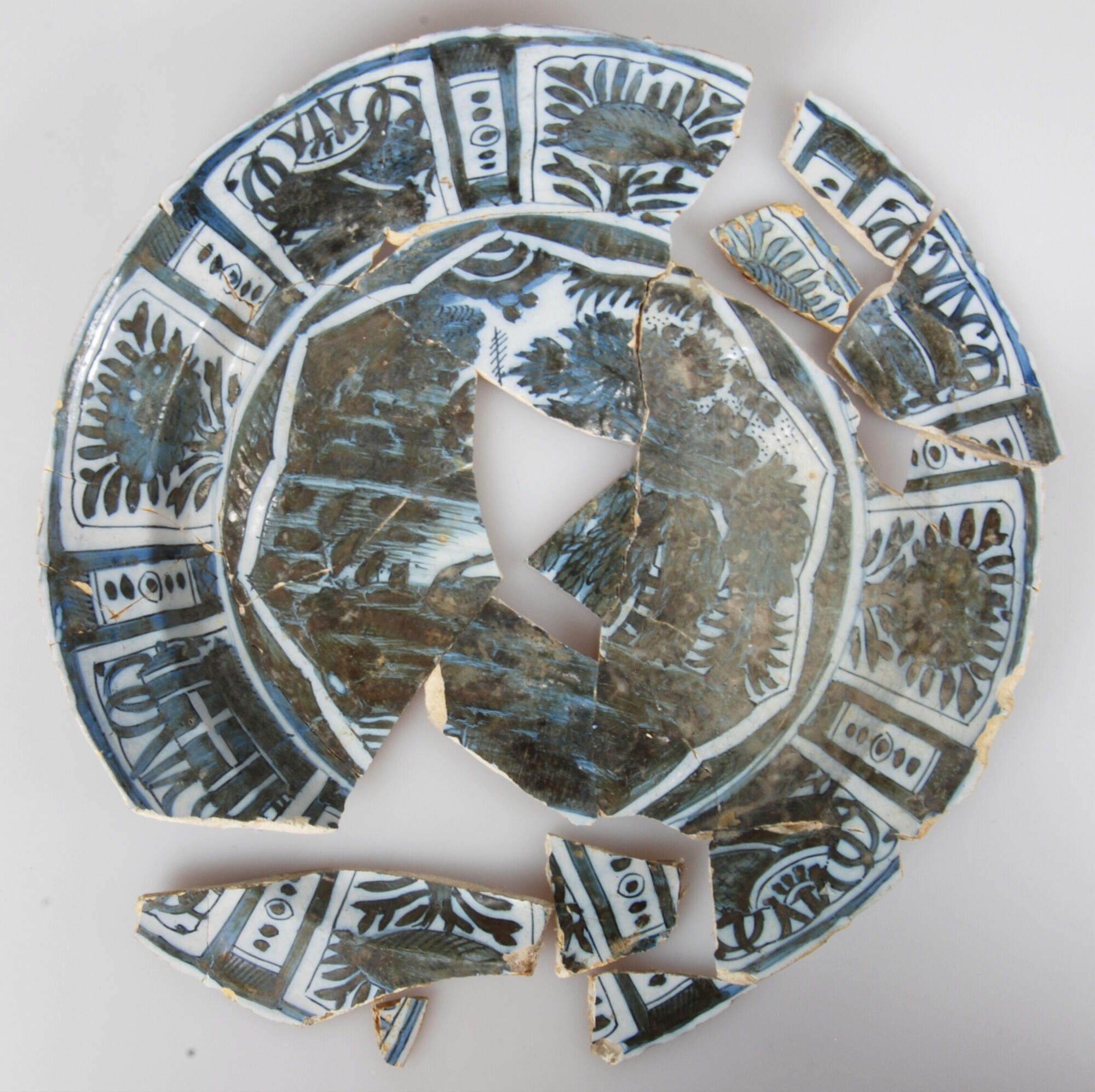 Bord; f-bor-6; tinglazuur; blauw op wit, spiegel: waterlandschap met zwaan binnen accoladerand, vlag: vakken met Chinese symbolen, achterzijde: strepen en cirkels; standring; archeologisch compleet; herkomst: Nederland; bestaat uit negen bij elkaar horende fragmenten