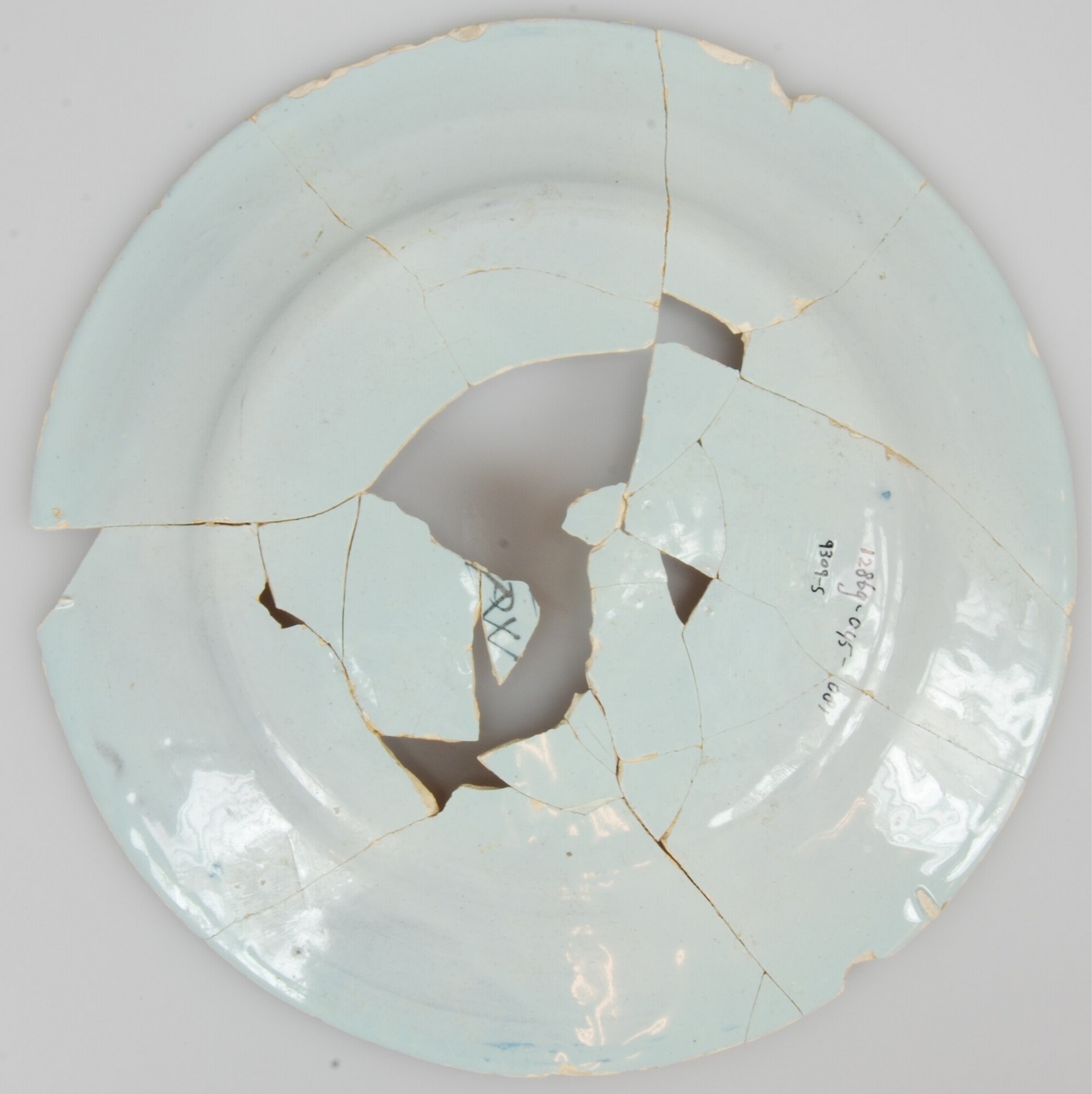 Bord; f-bor-2; tinglazuur; blauw op lichtblauw, spiegel: vogel in Chinees landschap, vlag: bloemen, achterzijde: ''PAW'' monogram, ''De Pauw''; standring; archeologisch compleet; herkomst: Delft; vier losse fragmenten die aan het bord passen
