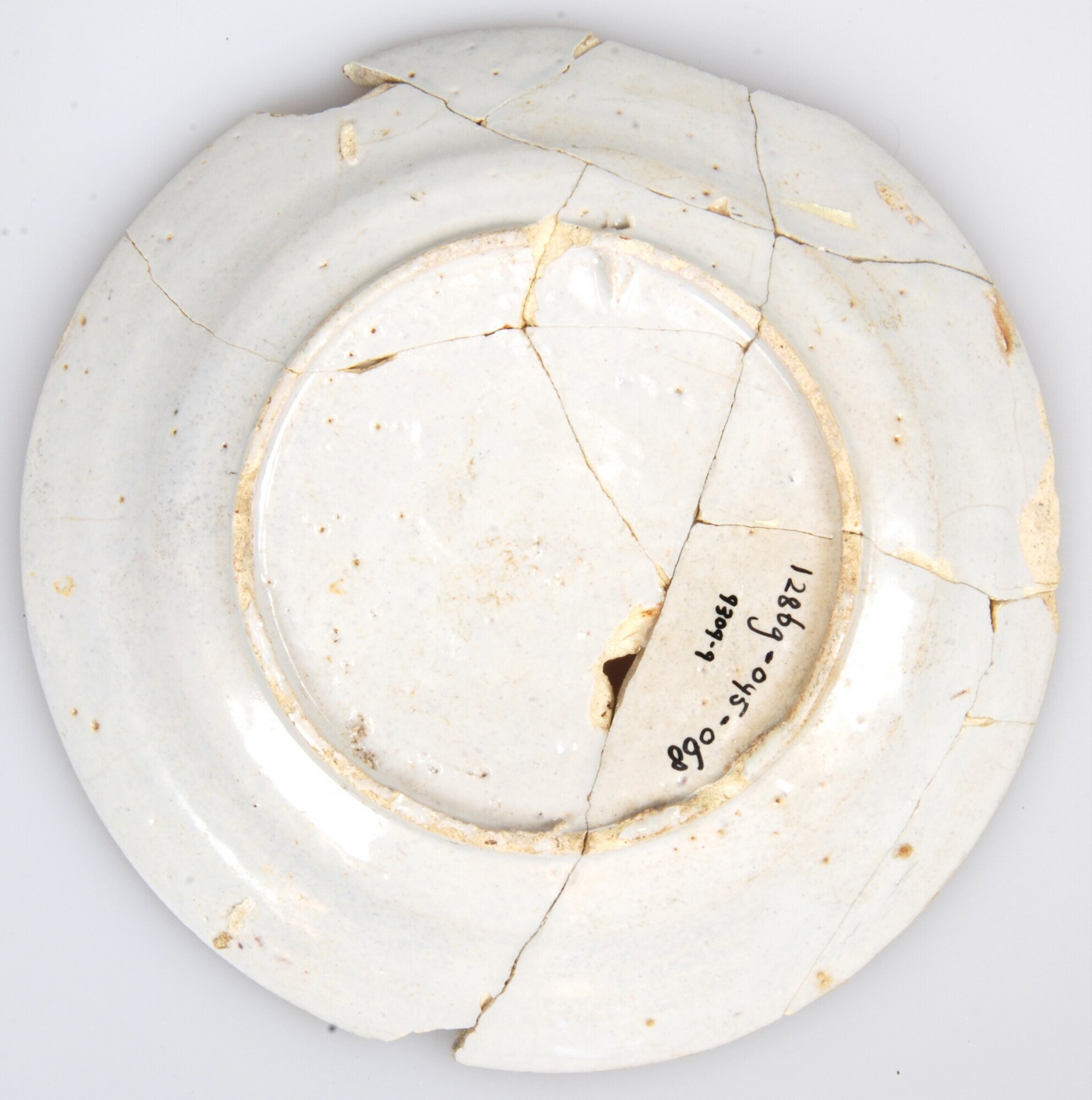 Bord; f-bor-1; faience; tinglazuur; paars/blauw/geel/groen op wit: vlag: golfjes, spiegel: fruitstilleven; standring; compleet; herkomst: Nederland