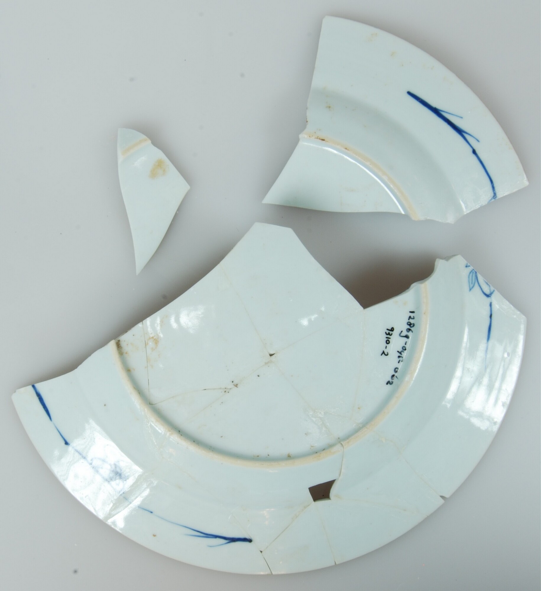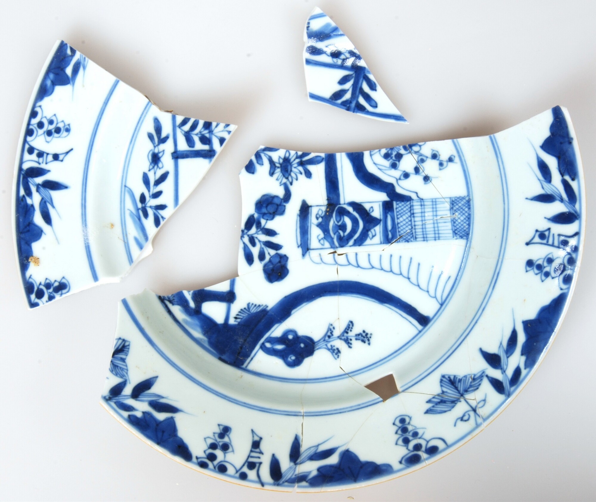 Bord; p-bor-5; porselein; veldspaatglazuur/kobaltoxide; onderglazuur blauw; spiegel: Chinese tuin, vlag: bloemenrand; standring; archeologisch compleet; herkomst: China; bestaat uit drie bij elkaar horende fragmenten