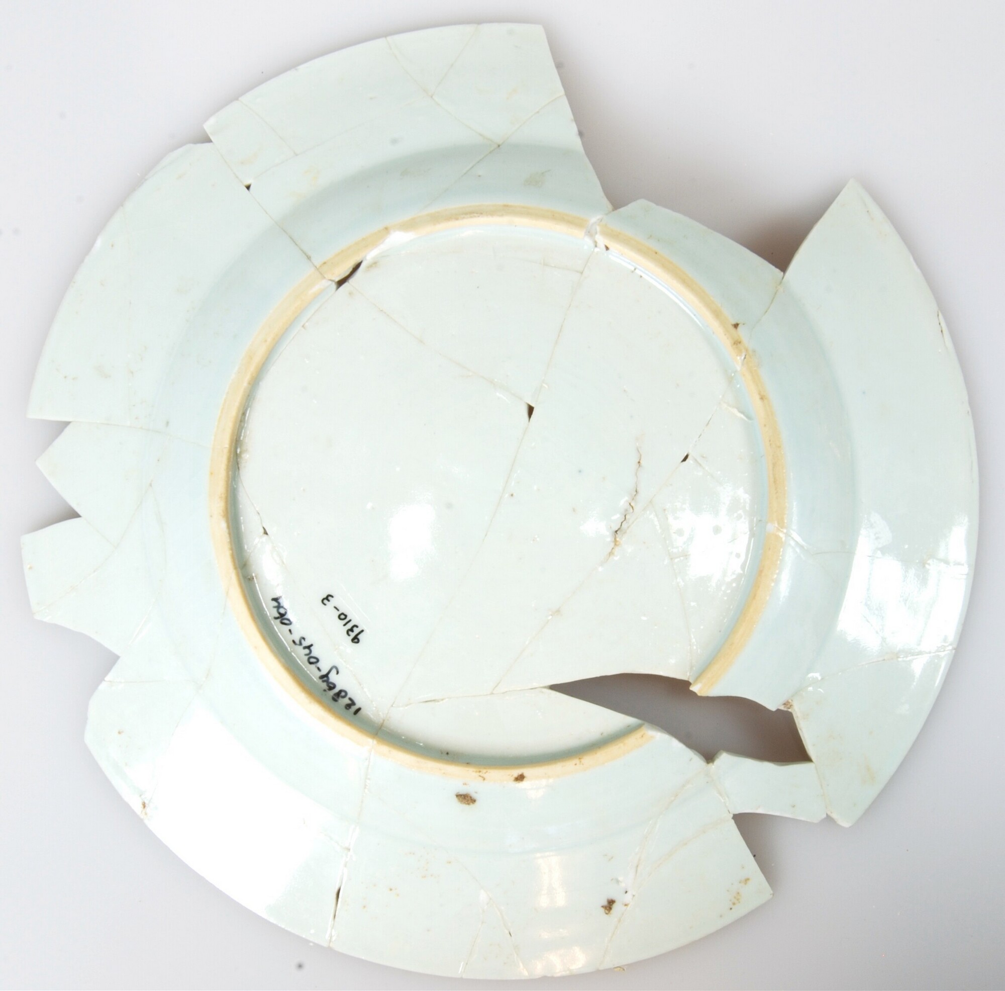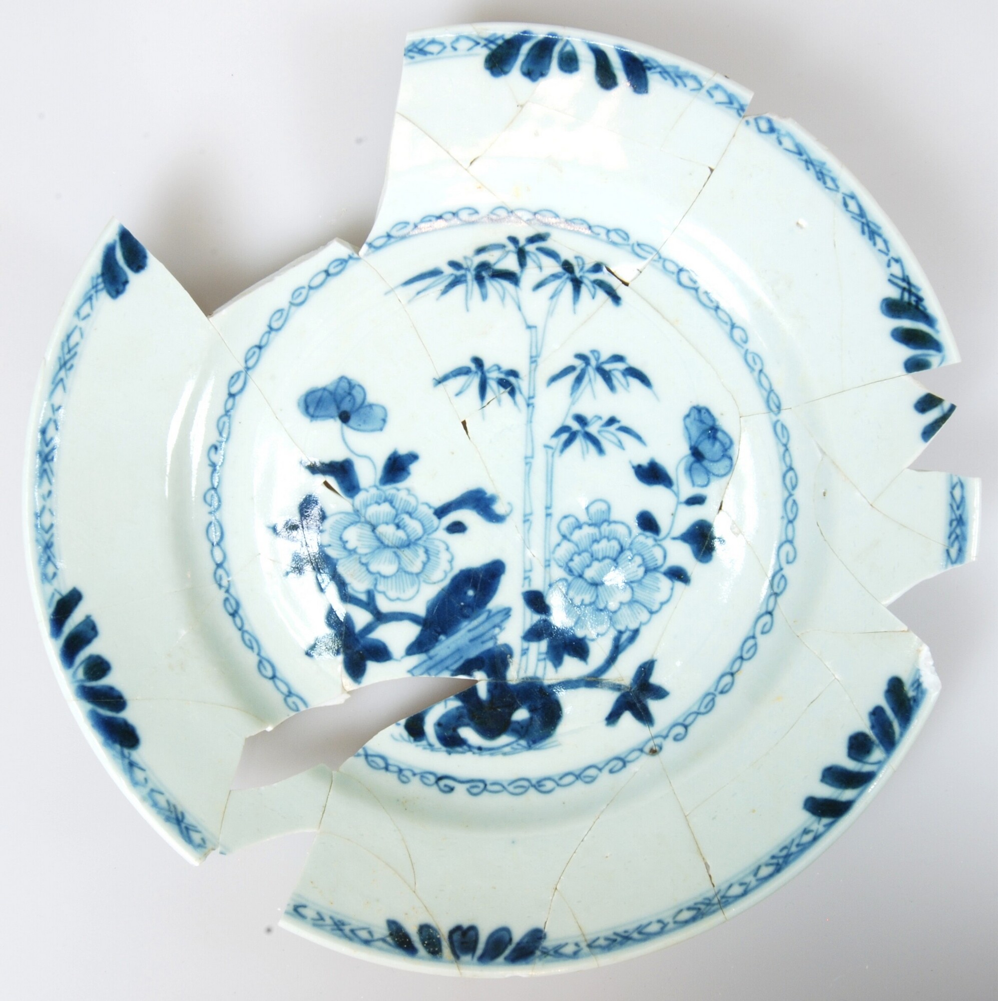 Bord; p-bor-5; porselein; veldspaatglazuur/kobaltoxide; onderglazuur blauw; spiegel: chrysant en andere bloemen, vlag: bloemen in 'Kakiemon'-dessin; standring; archeologisch compleet; herkomst: China;