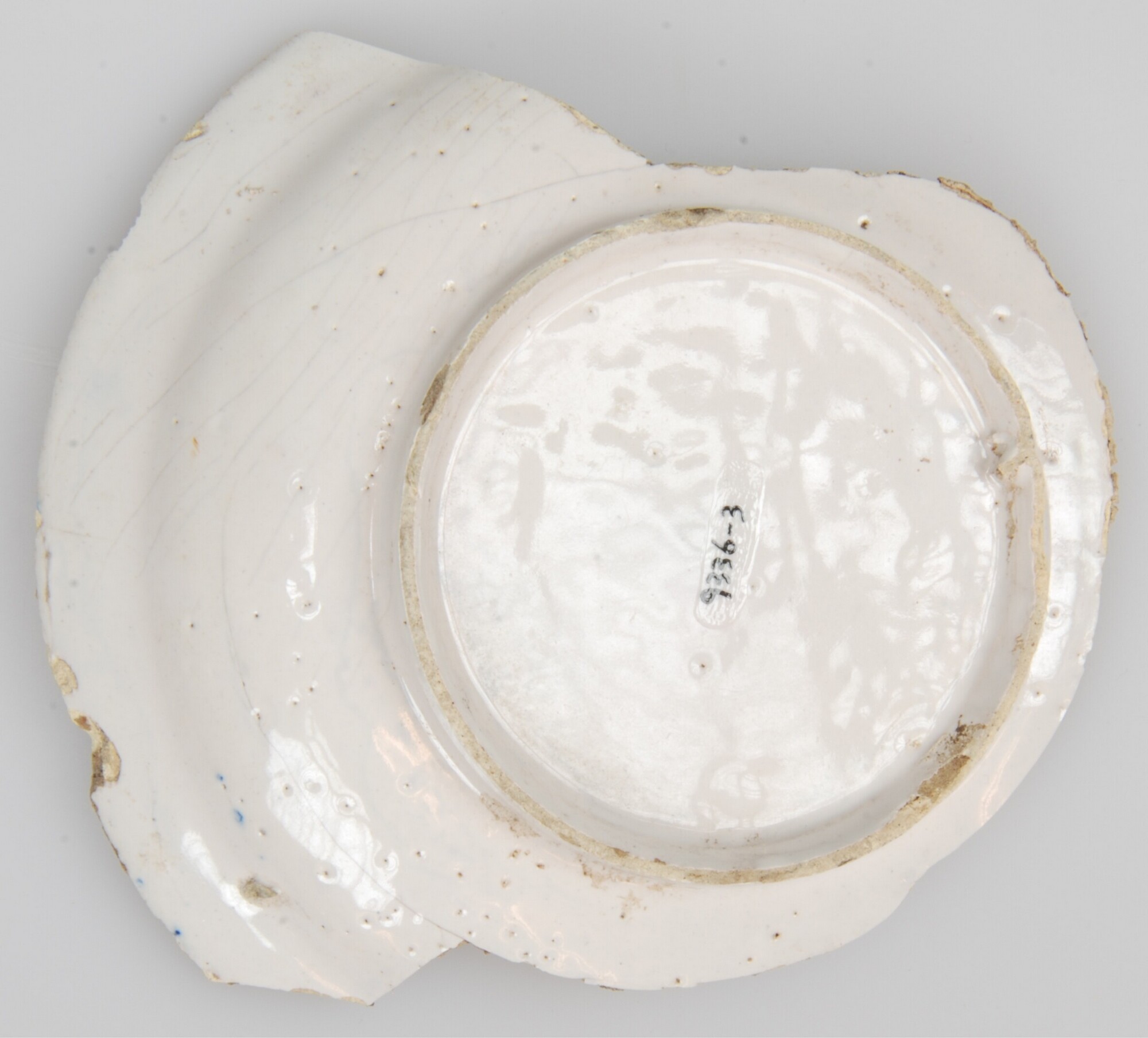 Bord; f-bor-7; bord met naar buiten geknikte vlag, op standring; faience; tinglazuur; blauwe beschildering, spiegel: bloem, vlak: haaltjes; standring; herkomst: West-Nederland, Delft (?)