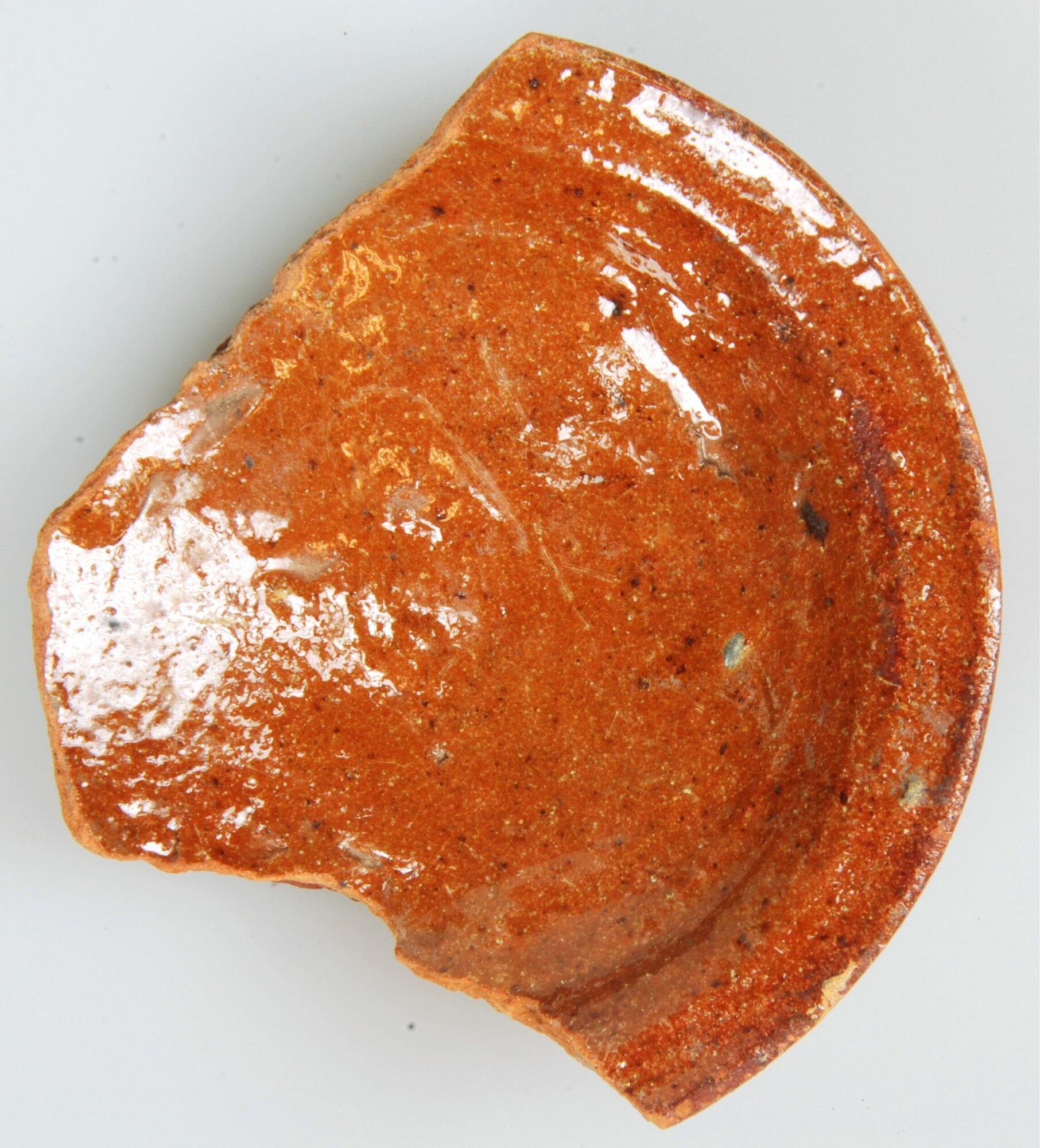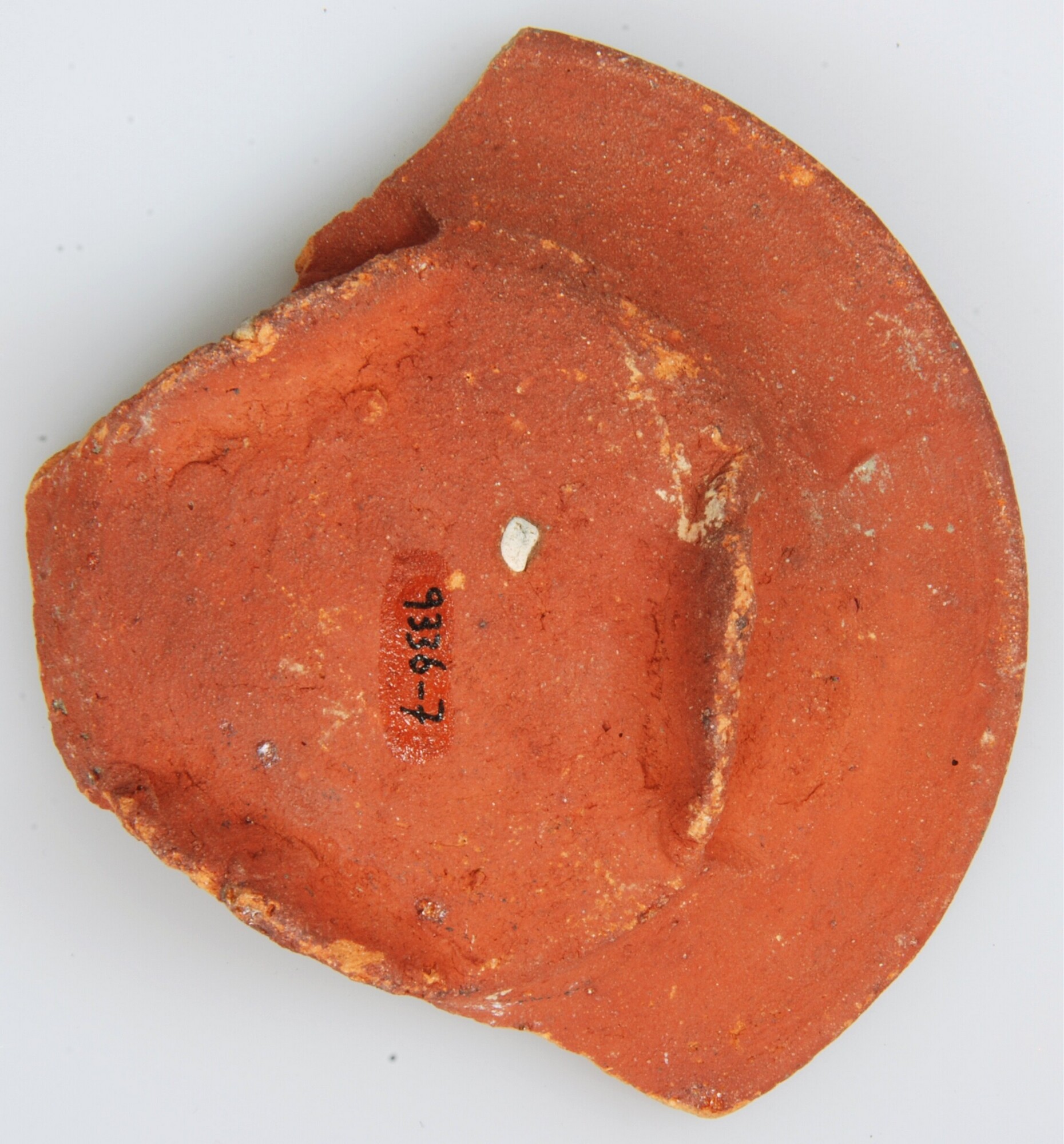 Bord of zoutschaal?; r-bor-1; bord met holle spiegel en uitgebogen vlag, op standlobben; roodbakkend aardewerk; bovenzijde loodglazuur; drie standlobben; herkomst: Nederland; vondstomstandigheden: havenvulling t.h.v. Kaasmarkt 16