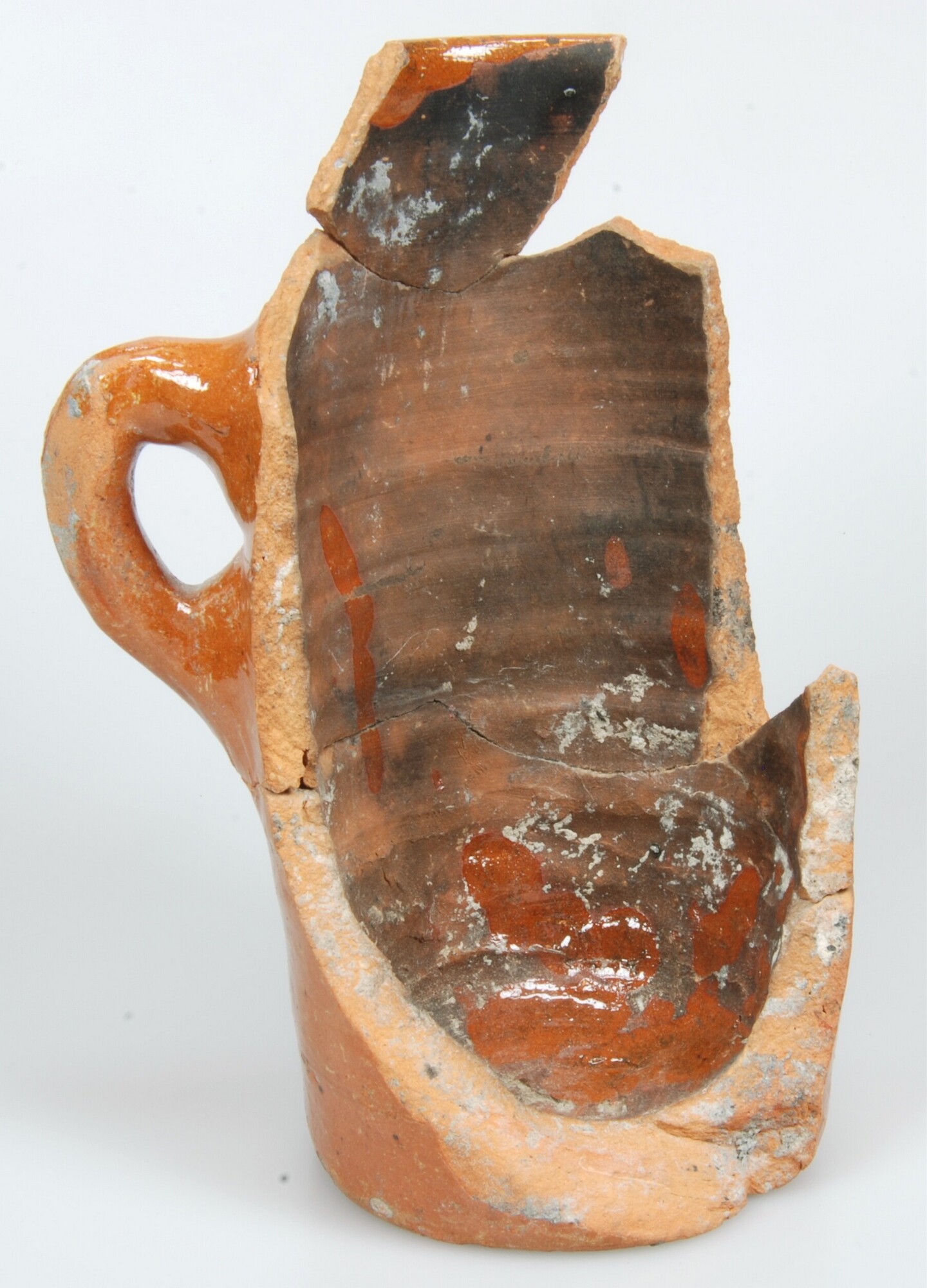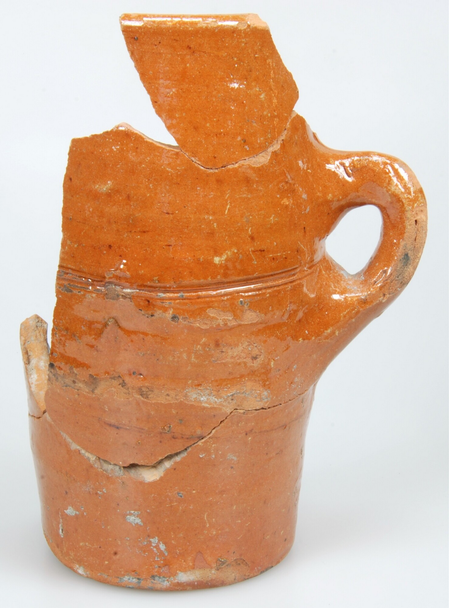 Pot; r-pot-82; hoge, smalle pot met rechte rand, op standring; roodbakkend aardewerk; uitwendig loodglazuur, inwendig ongeglazuurd; standring; worstoor op wand; inwendig beroet; herkomst: Nederland; vondstomstandigheden: afvallaag Verlaat