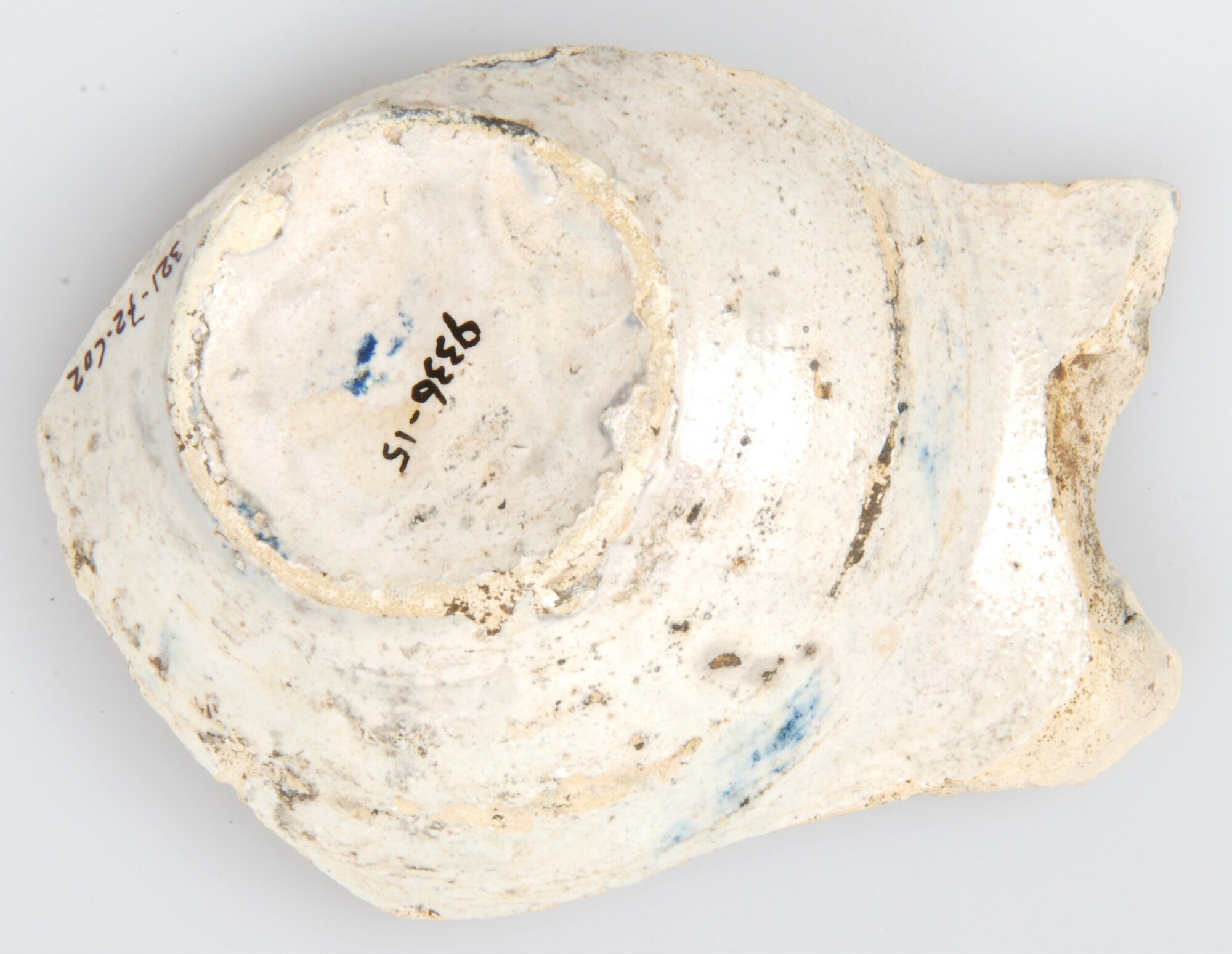 Kom; i-kom-237; italiaans tinglazuur aardewerk; voor- en achterzijde tinglazuur; bodemfragment met platte vlag; polychroom: inwendig: bloemmotief op spiegel binnen concentrische cirkels; uitwendig: onbeschilderd; standvlak; herkomst: Montelupo, Italie