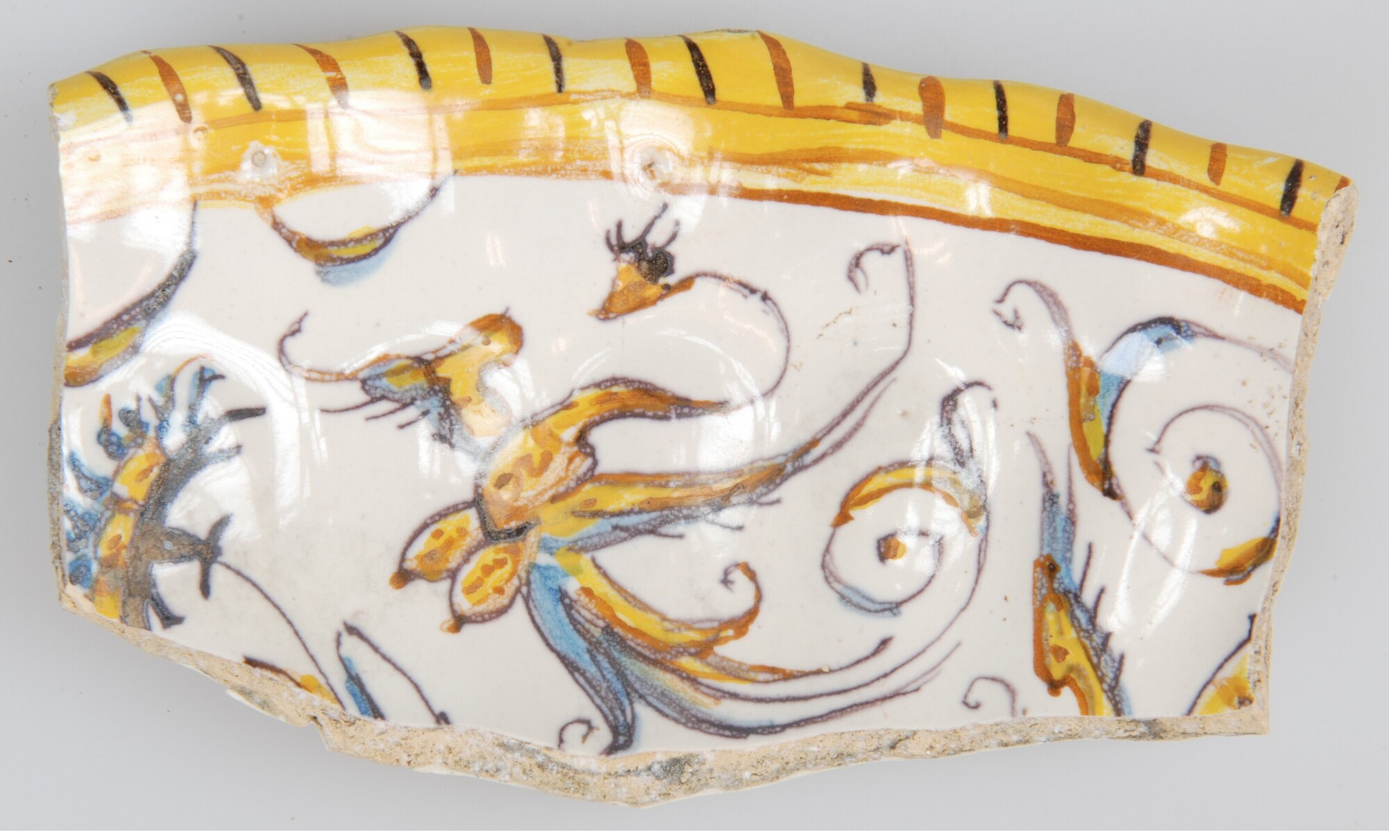 Plooischotel; i-plo; italiaans faience; randfragment in de stijl A Raffaellesca; onder de gele kabelrand zijn fantasiefiguren afgebeeld. Deze figuren zijn omlijnd in mangaan en vervolgens ingevuld met de kleuren geel, oranje en blauw; op de achterzijde is een gele streep aanwezig; herkomst: Deruta of Urbino, Italie