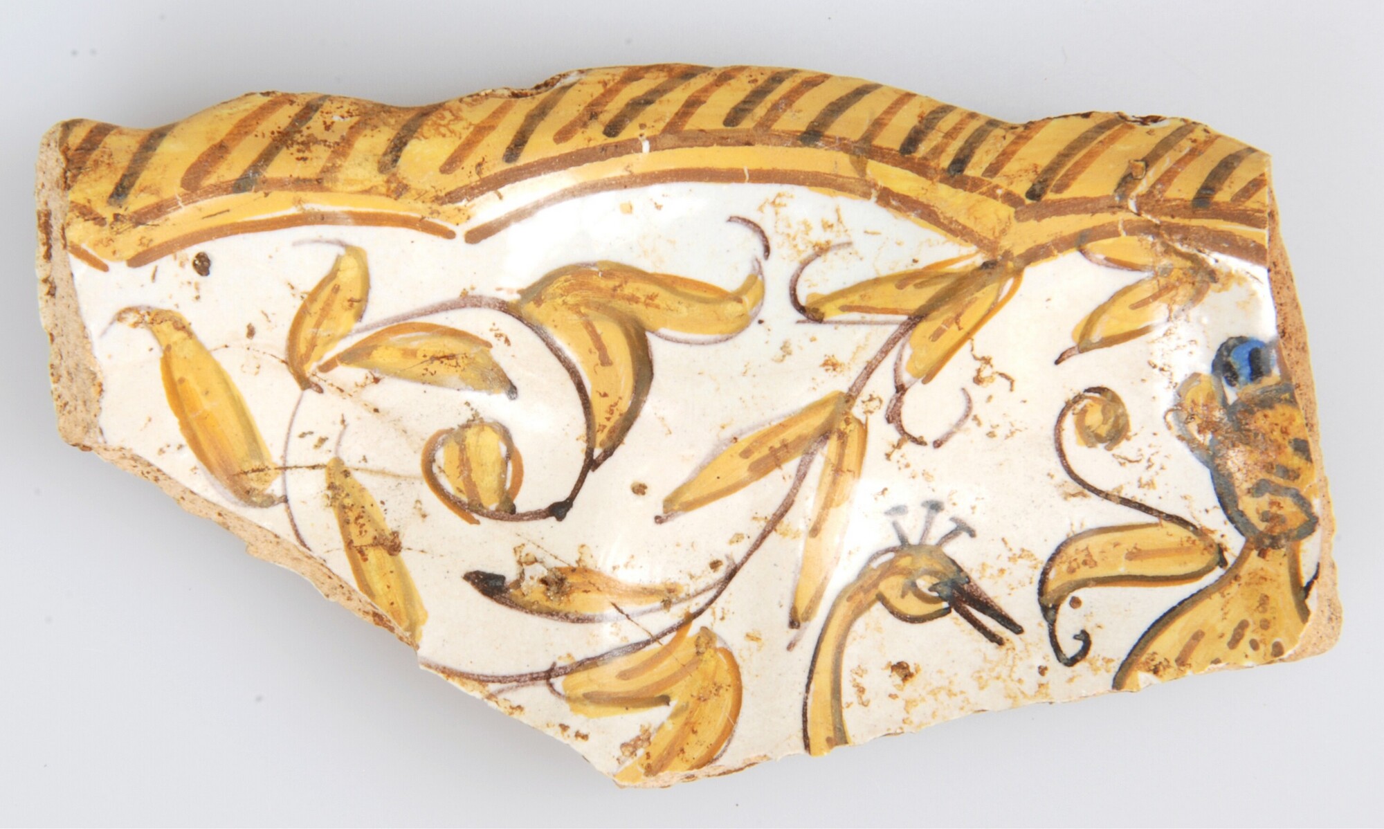 Plooischotel; f-plo; nederlands faience; randfragment in imiatie A Raffaellesca stijl; onder de gele kabelrand zijn fantasiefiguren afgebeeld. Deze figuren zijn omlijnd in mangaan en vervolgens ingevuld met de kleuren geel, oranje en blauw; herkomst: Verstraeten atelier, Haarlem; vondstomstandigheden: afvallaag onder laag 10 ten Oosten muur spoor 6