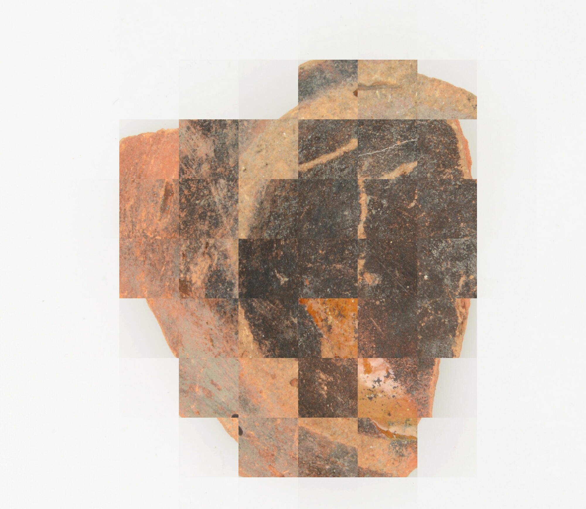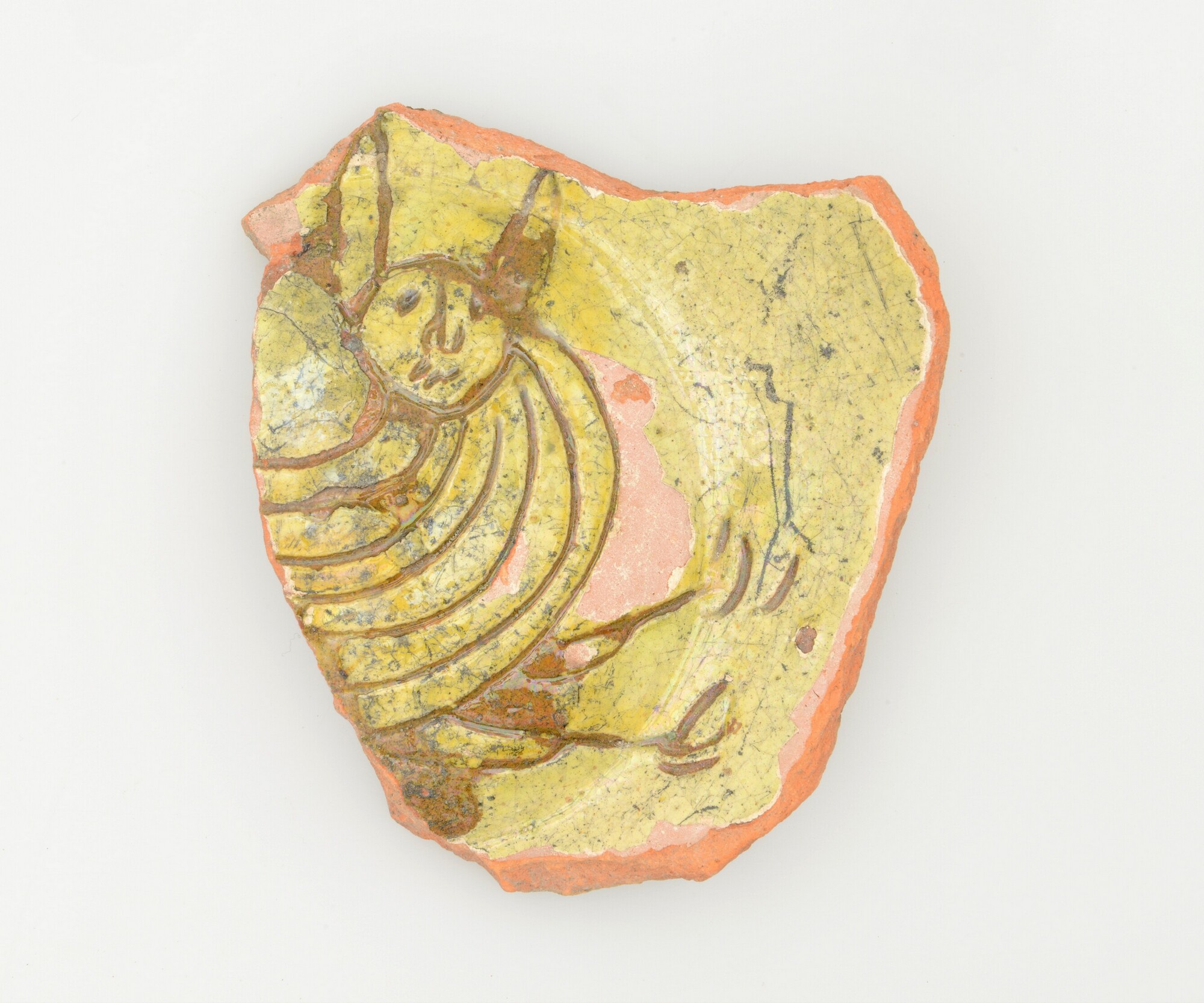 Kom; r-kom-; roodbakkend; loodglazuur en sliblaag; sgrafitto-techniek: fantasiedier met konijnenoren en vogelpoten; ziel