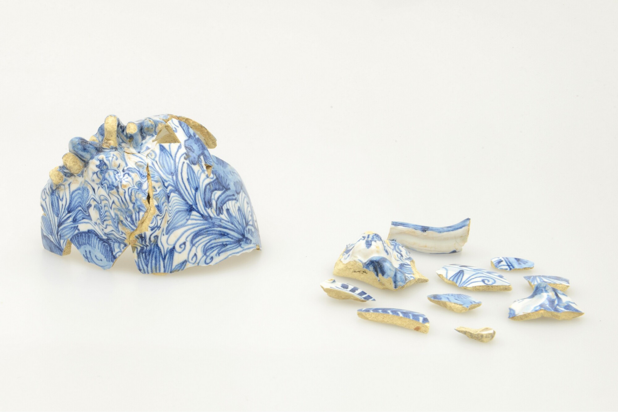 Vaas; i-vaa-; Italiaans faience; Calligrafico Naturalistico stijl: rennende hazen, leeuwenkoppen in relief met krullen