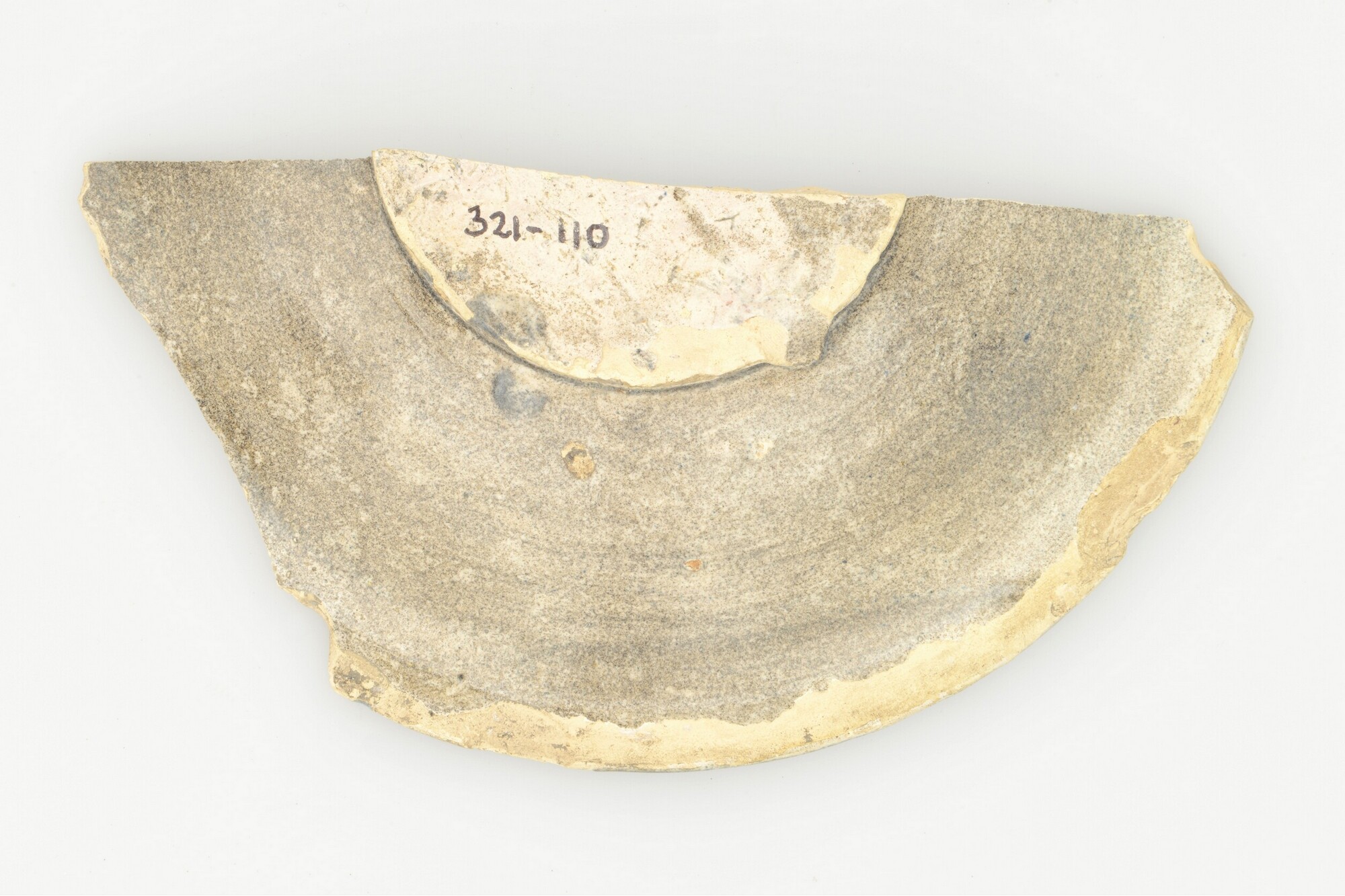 Bord; i-bor-9; bord zonder vlag met uitgebogen rand; Italiaans majolica; bovenzijde tinglazuur, onderzijde loodglazuur; polychrome beschildering, spiegel: granaatappel (?), vlag: ingekraste band met krullen; standvlak; herkomst: Montelupo, Italië