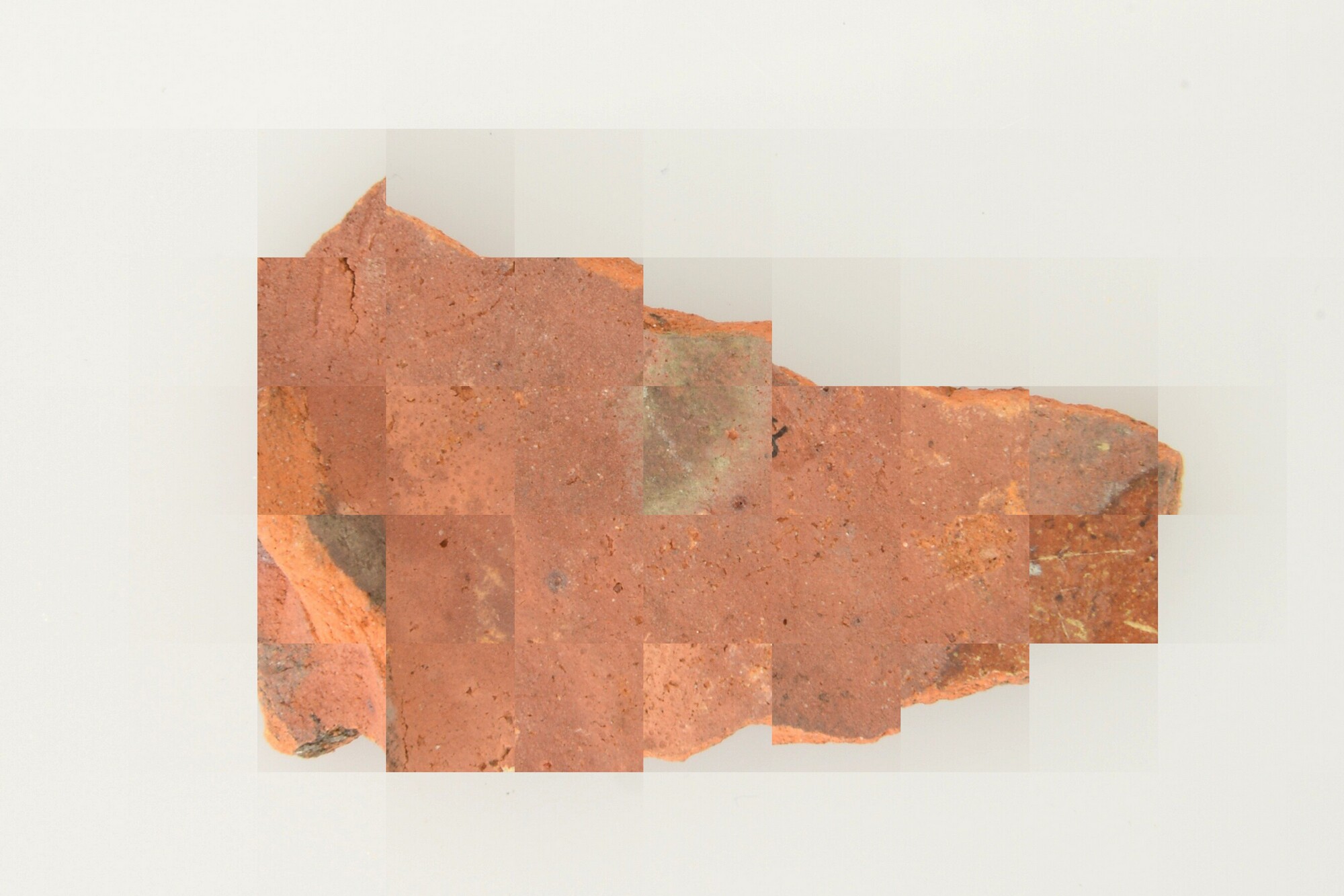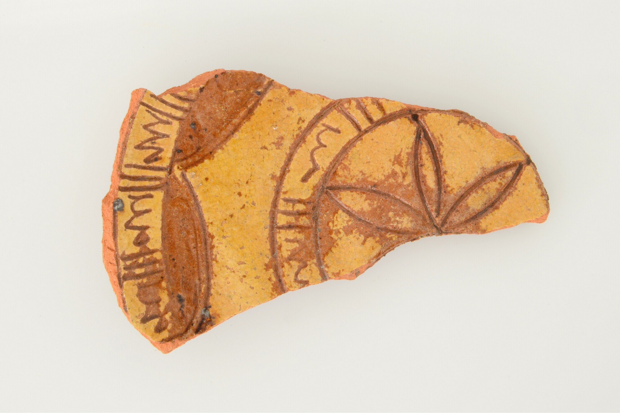 Bord; r-bor-; roodbakkend; loodglazuur; sgraffito-techniek: geometrische versiering; drie standlobben (twee ontbreken)