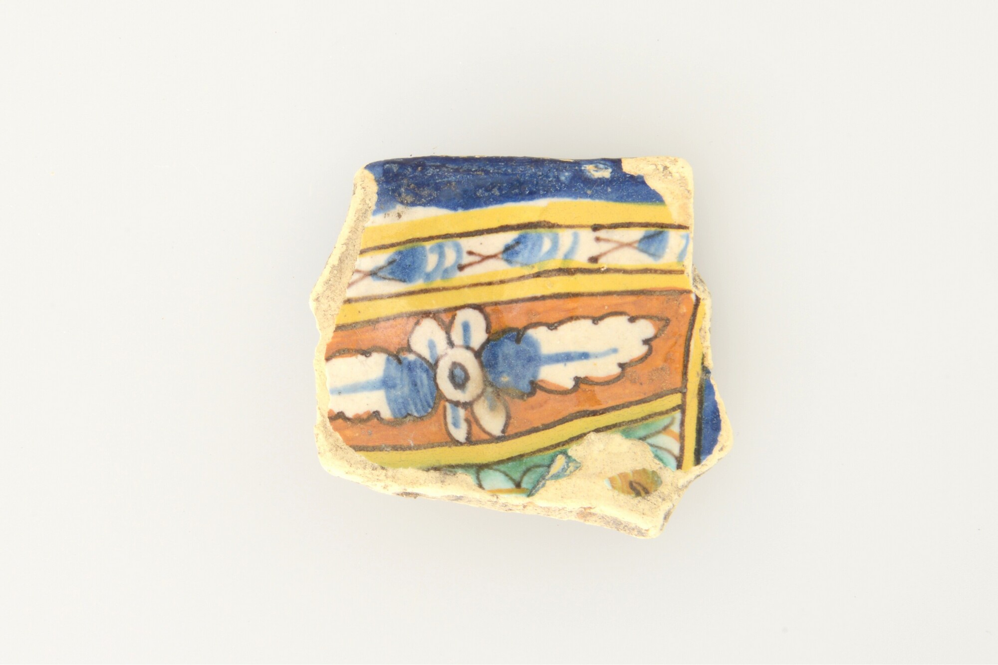 Plooischotel/crespina; i-plo-; Italiaans majolica/faience; polychrome beschildering; bloem in vakverdeling; herkomst: Montelupo, Italië
