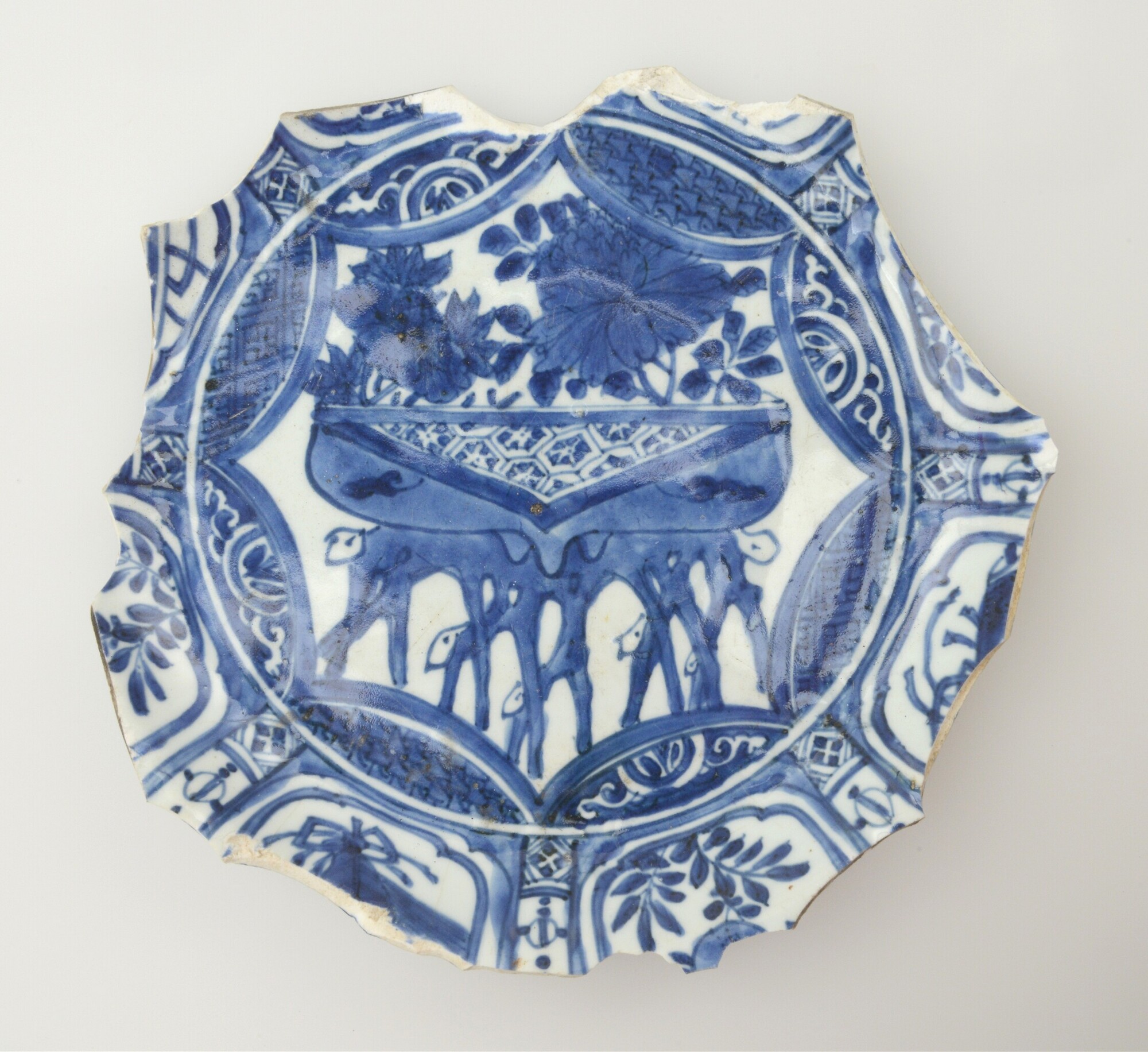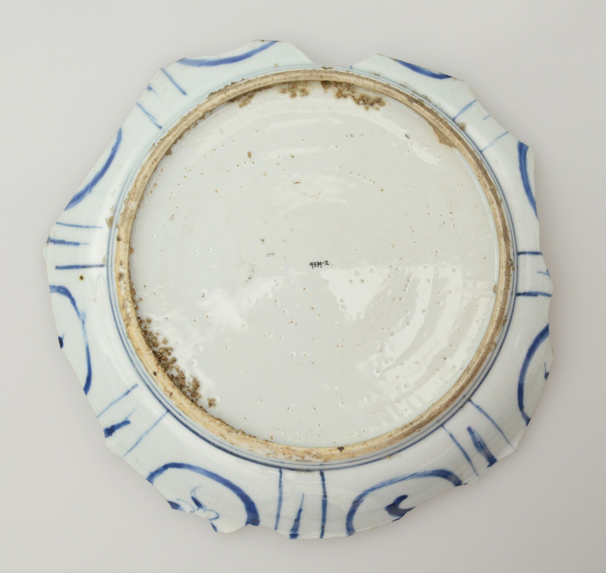 Bord; p-bor-; porselein; blauw op wit; standring (doorboord)