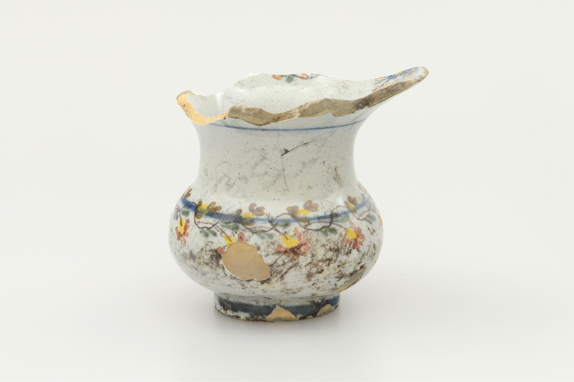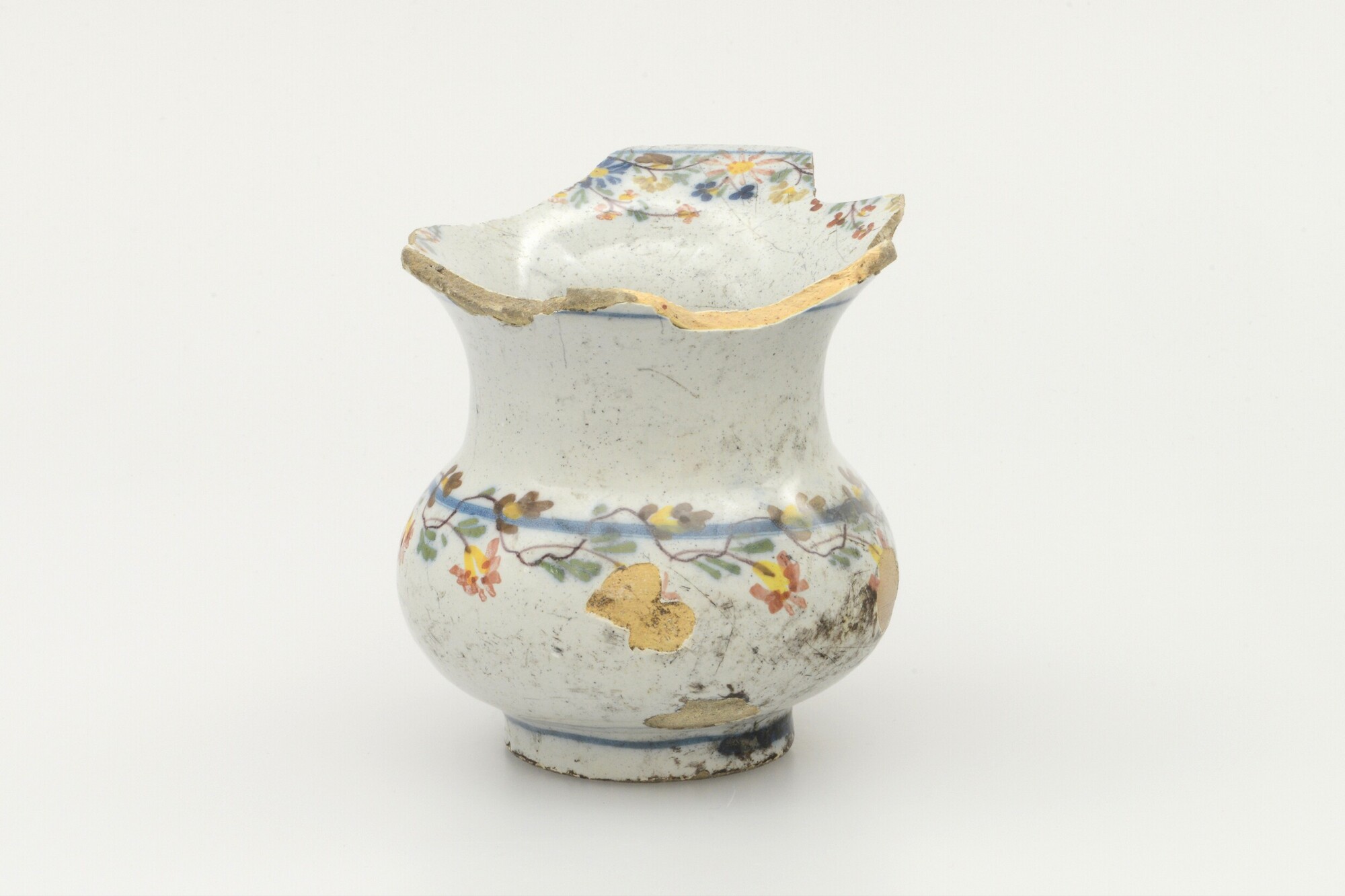 Kwispedoor; f-kwi-2; bolle kwispedoor met uitgebogen rand; faience; tinglazuur; polychrome beschildering, bloemen; standvoet; herkomst: Nederland