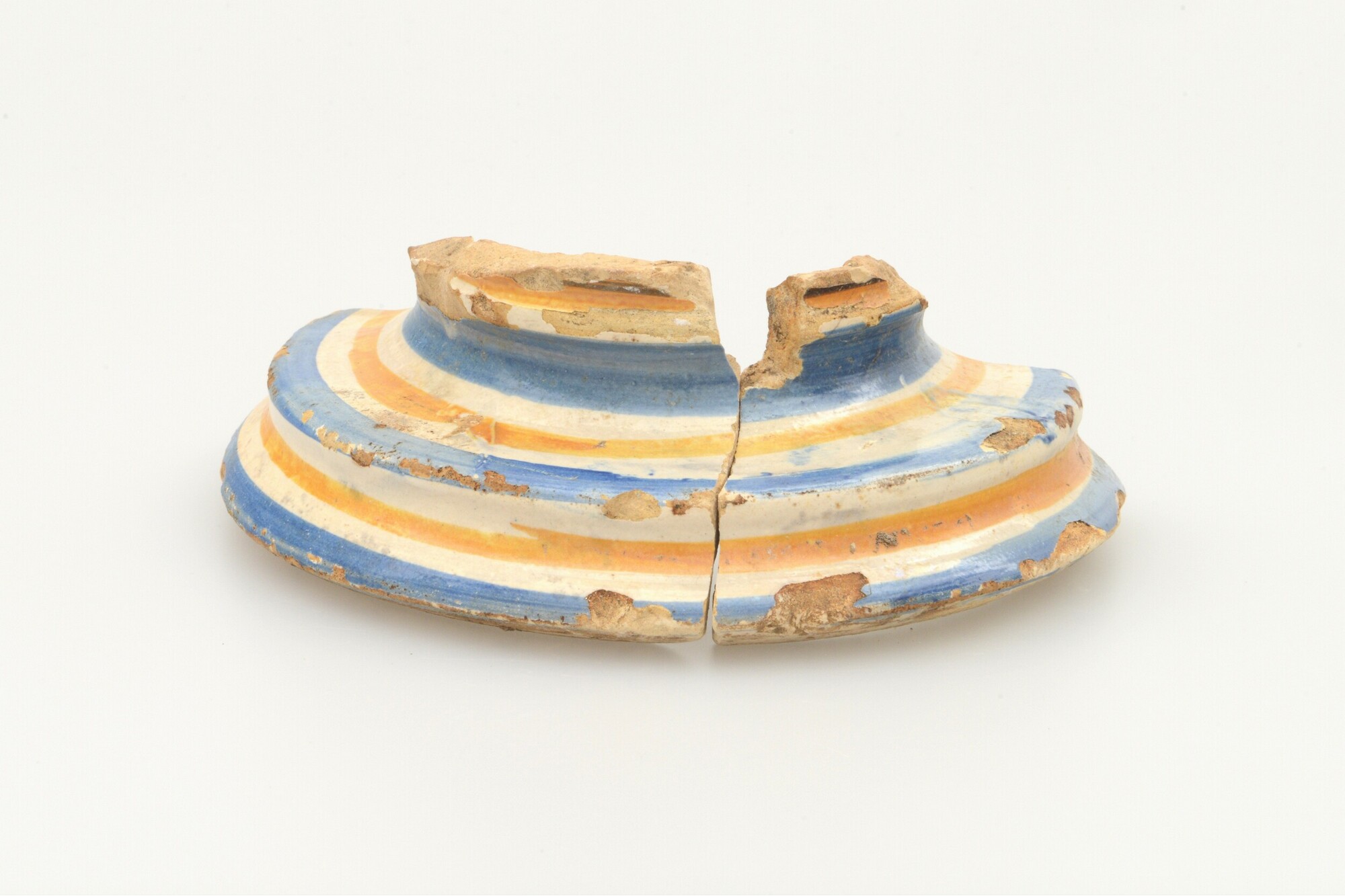 Kom; i-kom-3; voet van grote kom; blauwe en gele strepen; herkomst: Monte Lupo, Italie
