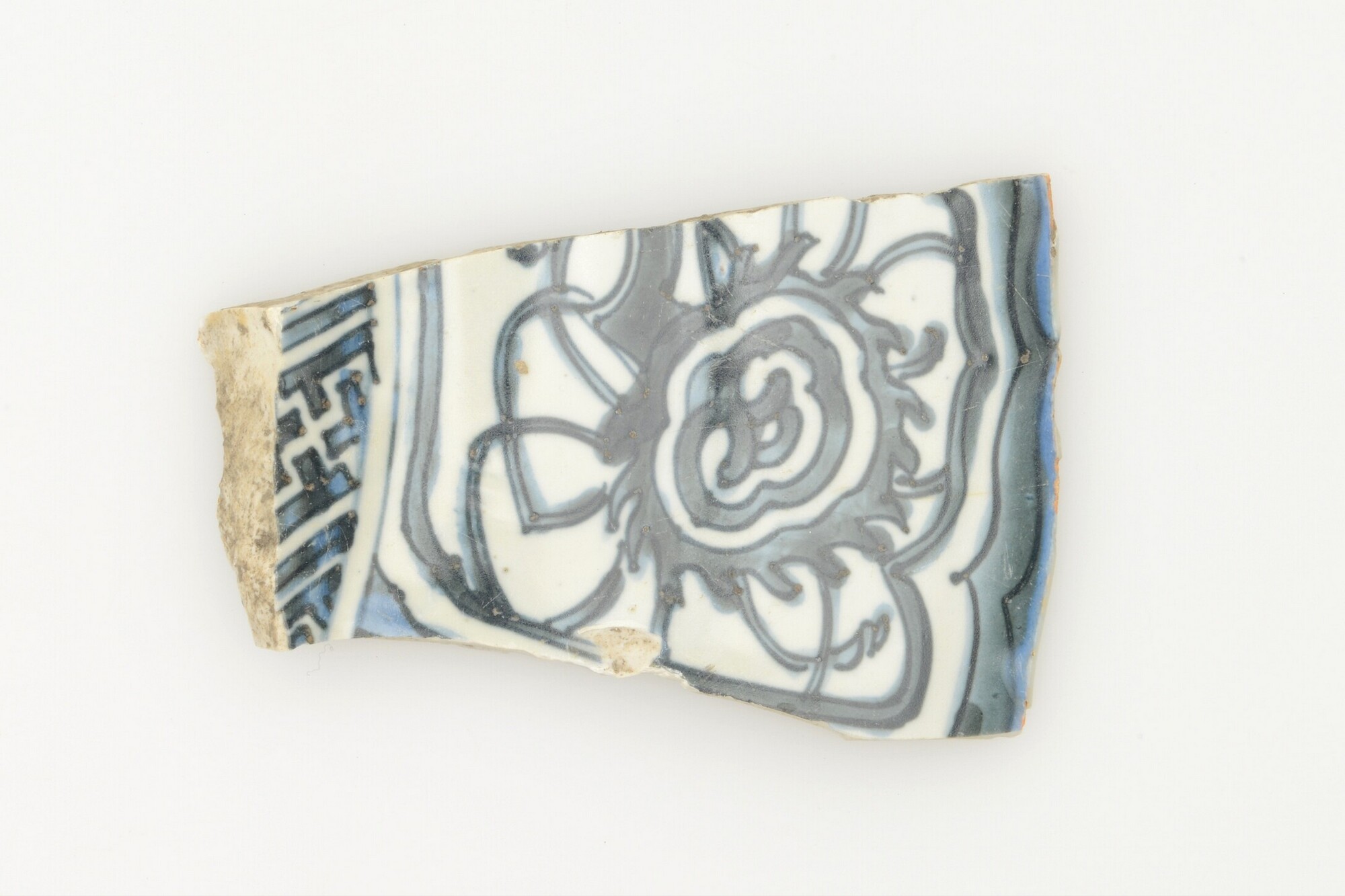 Bord; p-bor-4; Aziatisch kraakporselein; veldspaatglazuur; groenige verf, paneel met ruyi-motief; herkomst: China