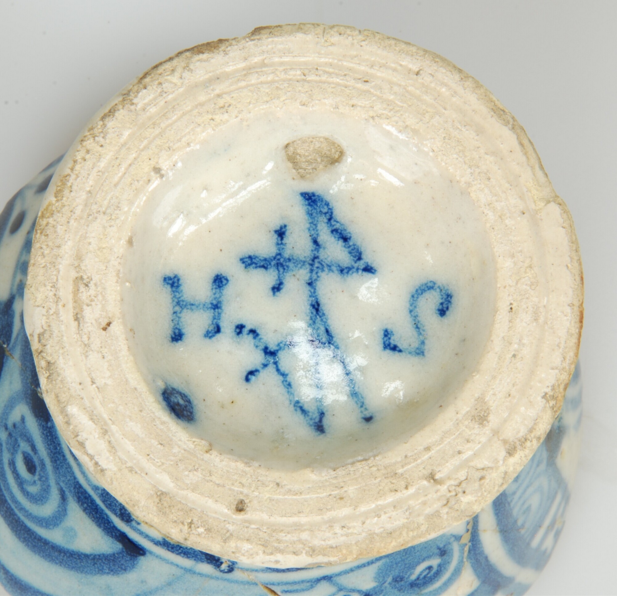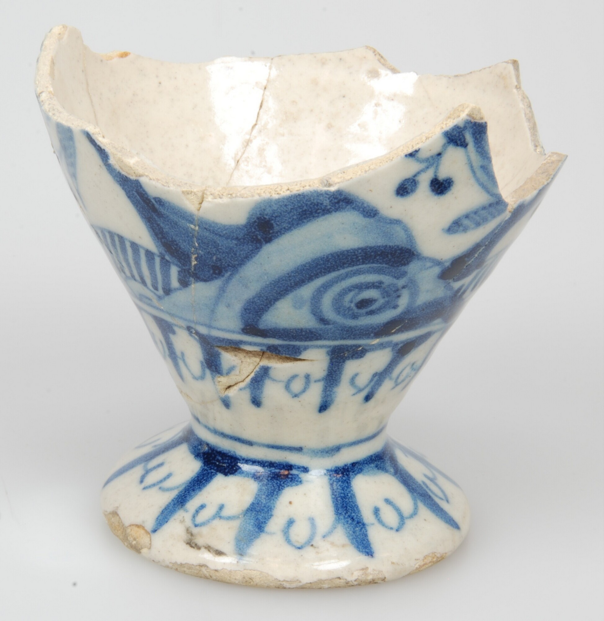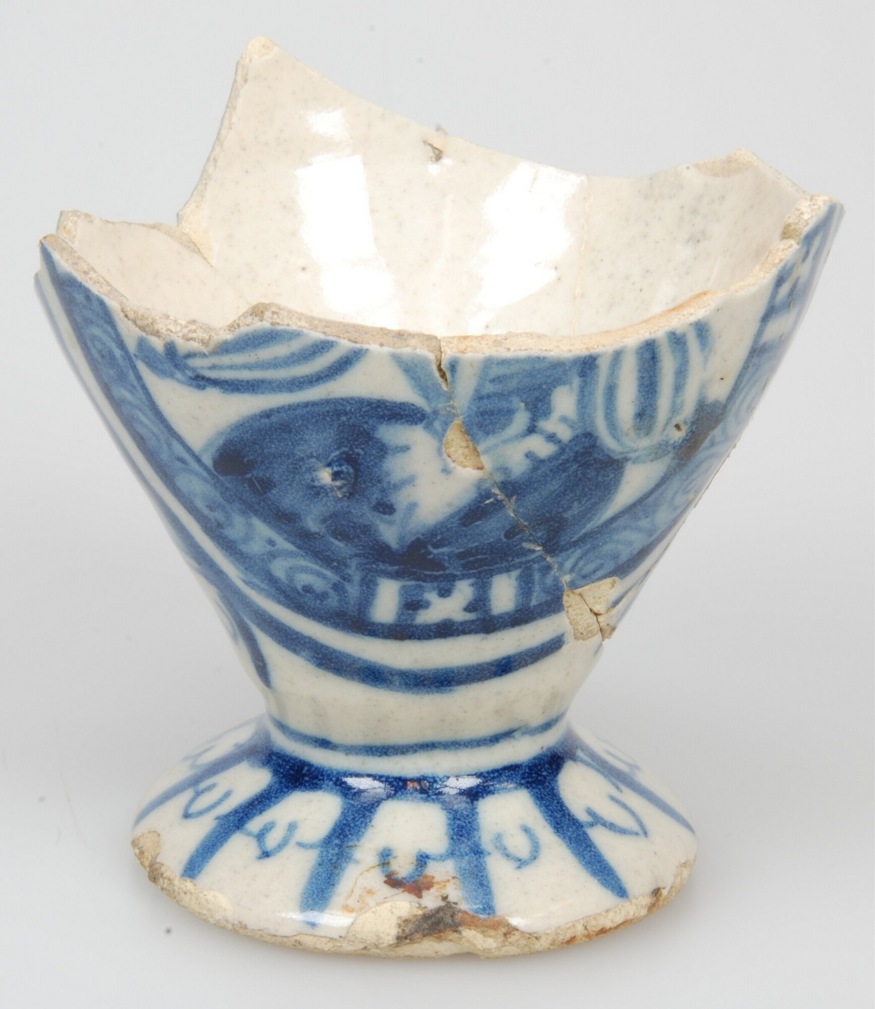 Kan; po-kan-?; faience; tinglazuur; blauwe beschildering; landschap en persoon in rond kader (?); standvoet; herkomst: Portugal
