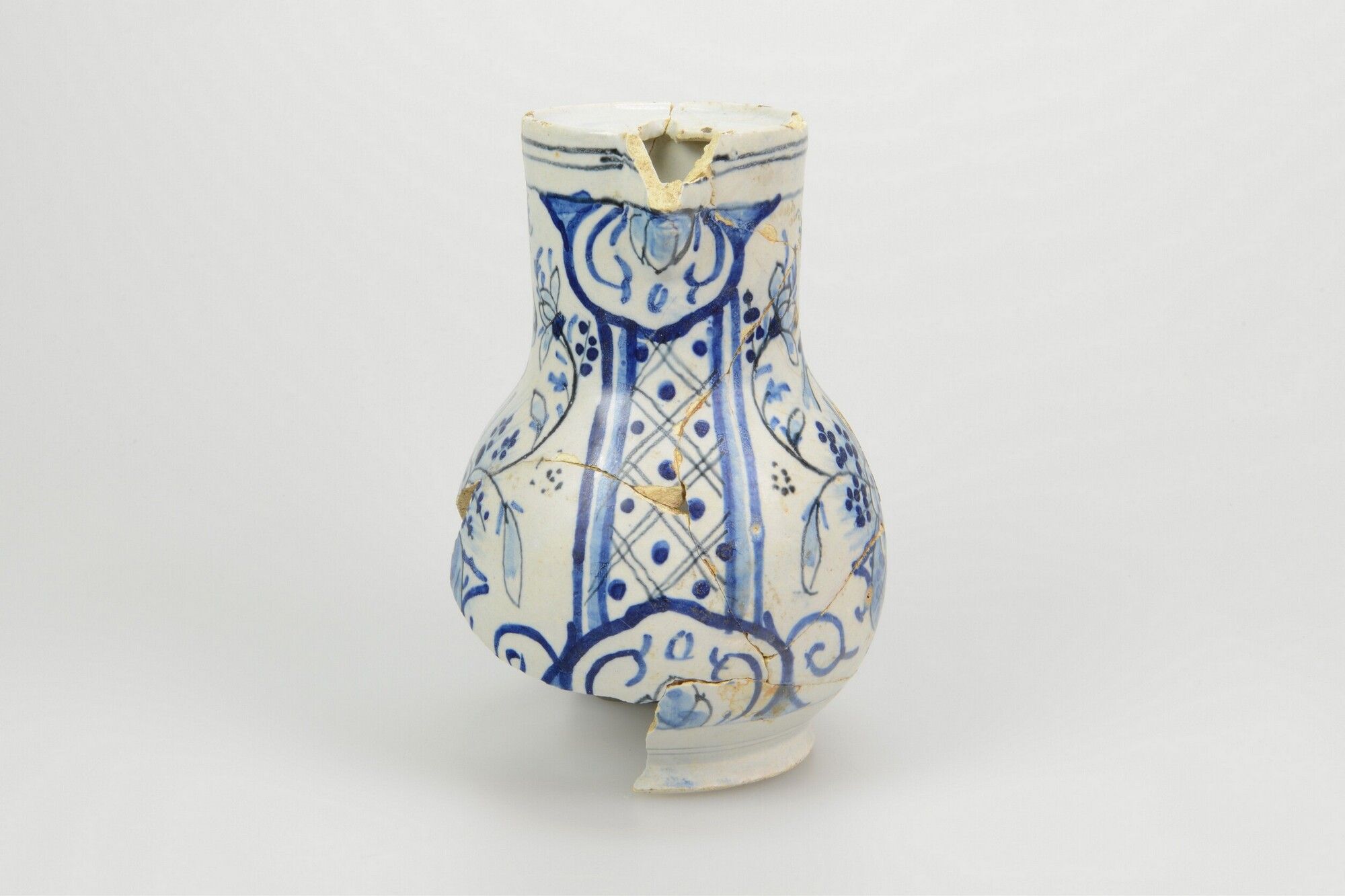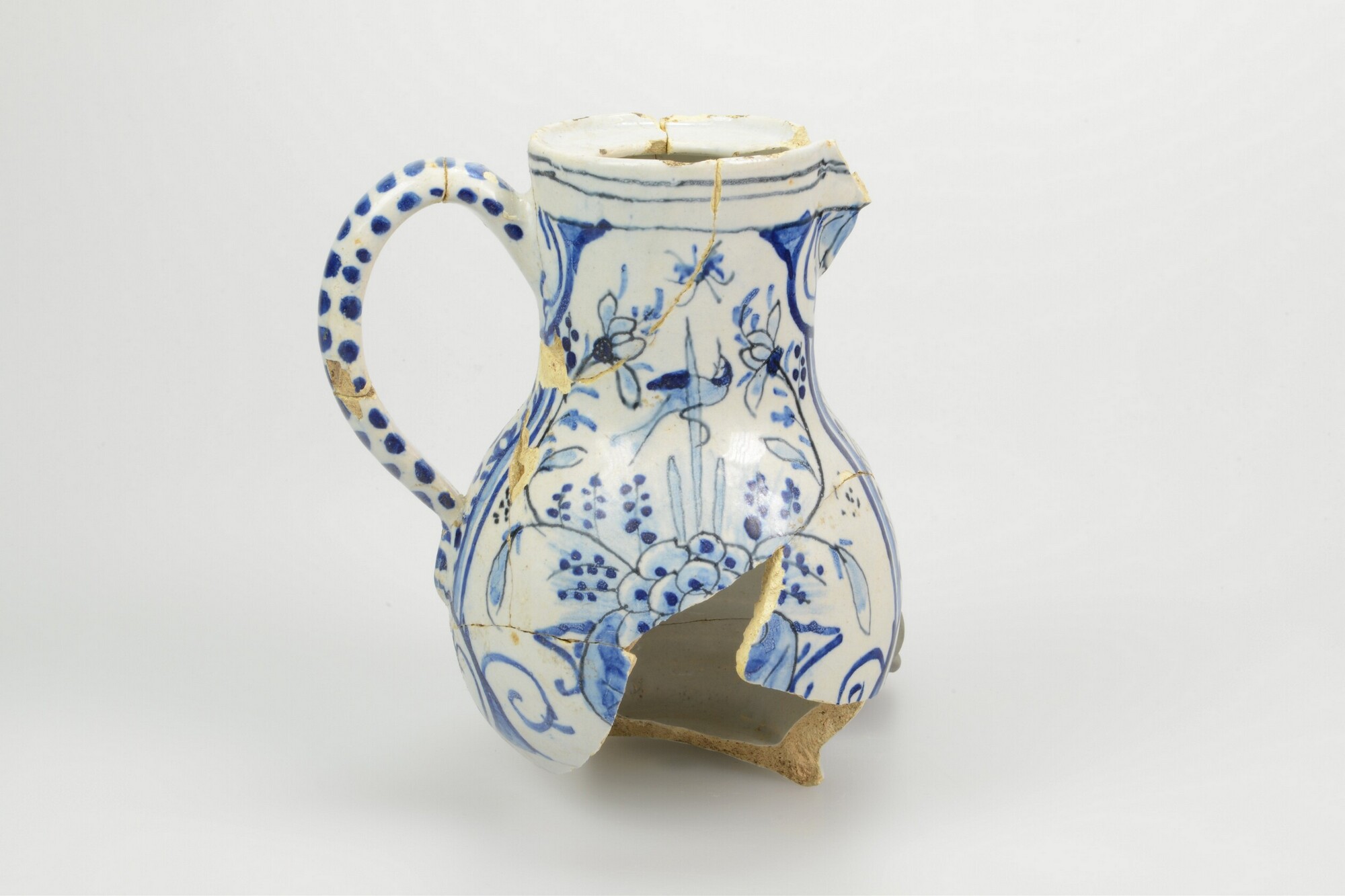 Kan; f-kan-7; kan met bolle buik en sluitrand voor deksel; faience; tinglazuur; blauwe beschildering: bloemenvazen met vogels en vlinders; schenktuit; standring; één verticaal oor