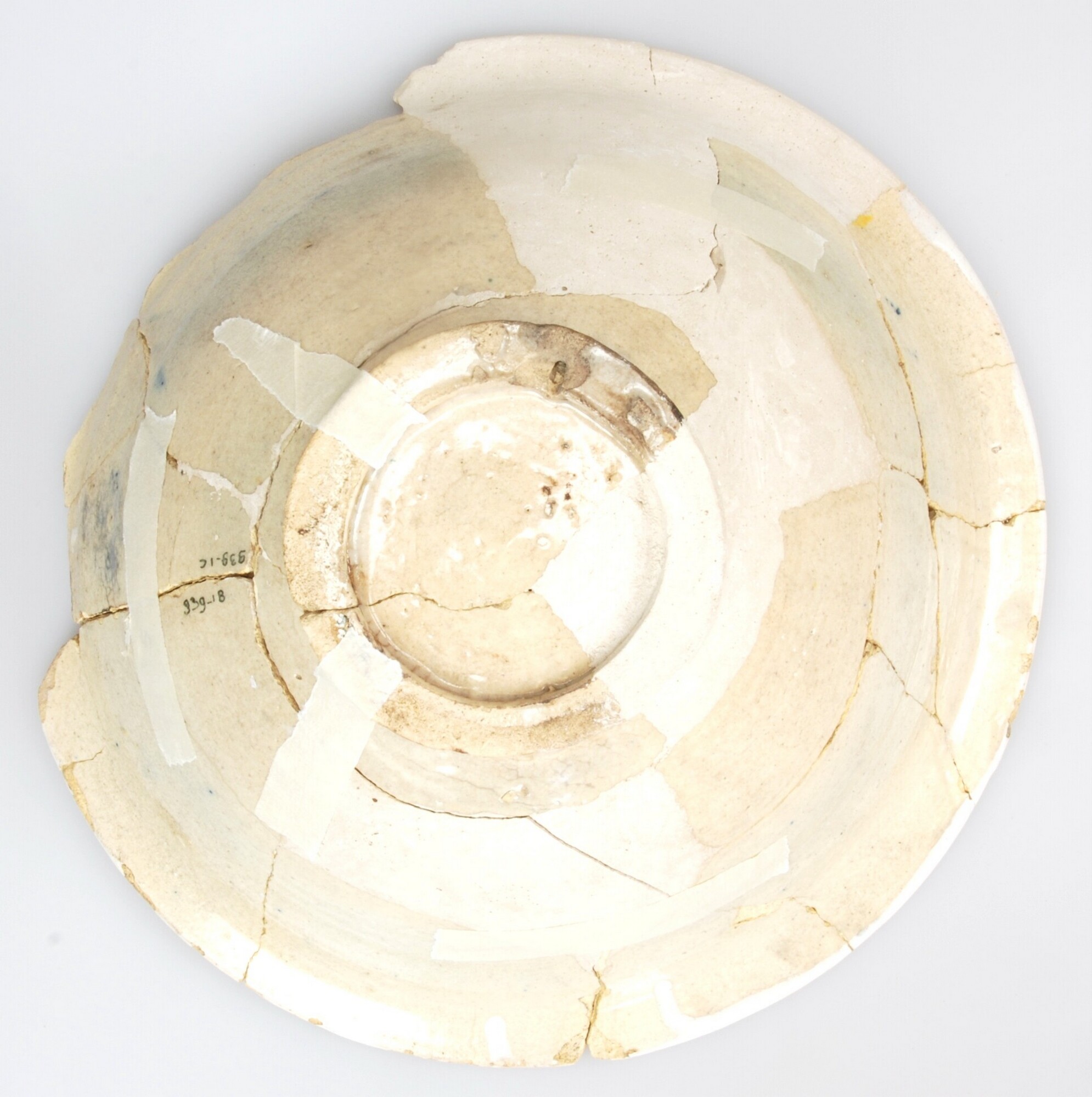 Kom; m-kom-6; majolica; lood/tinglazuur; bolle kom met naar buiten geknikte rand;blauw/gele beschildering: engel; standring