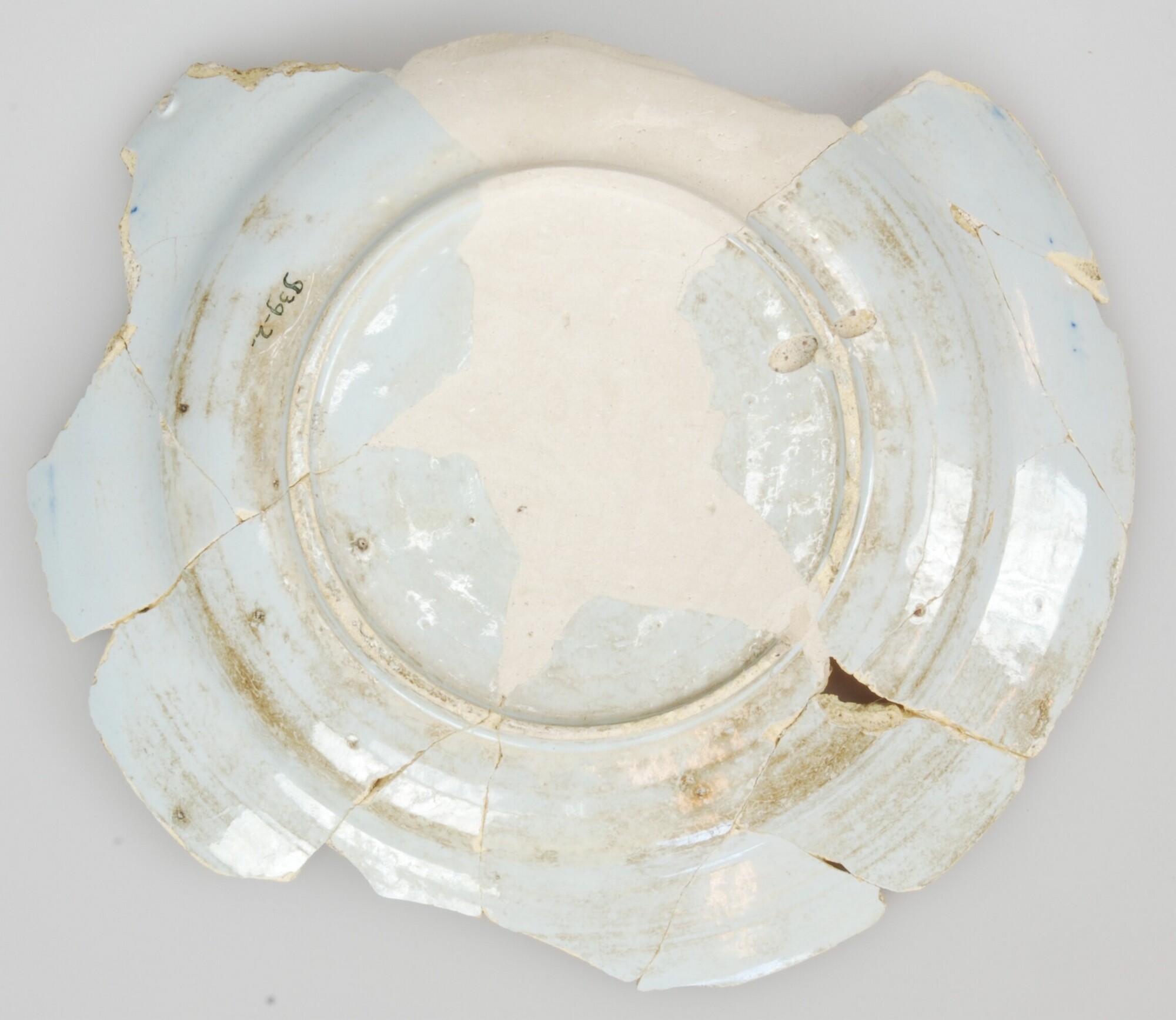 Bord; f-bor-5; faience; tinglazuur; afgerond bord met platte bodem en smalle vlag; standvlak; blauwe beschildering: vlag: krullen, spiegel: tienpuntige ster met bloemenvaas of wapenschild