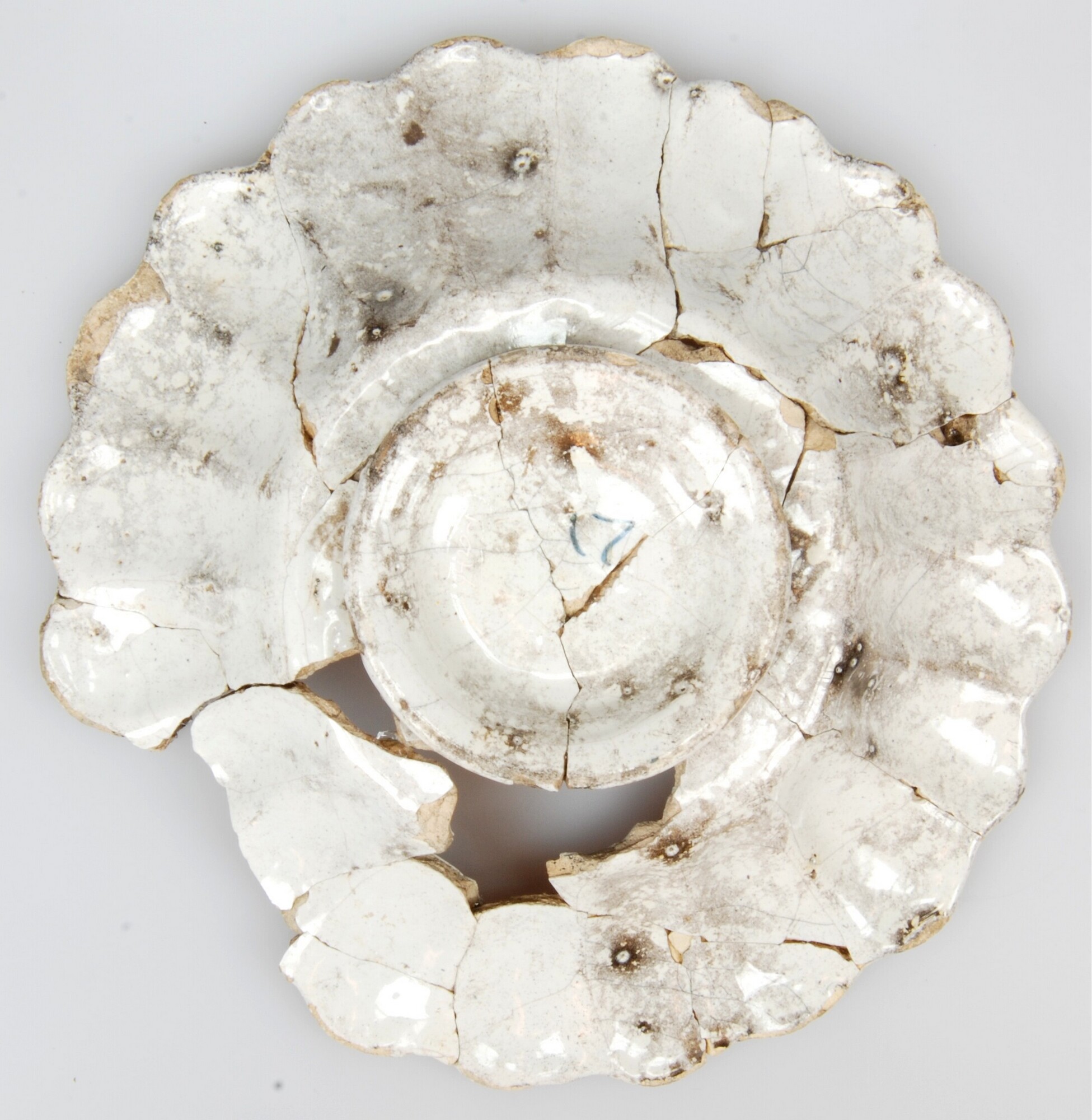 Plooischotel; f-plo-3; faience; tinglazuur; plooischotel met platte spiegel en grof geplooide vlag, scherpe knik spiegel-vlag; standring; blauwe beschildering: bloemen en nachtvlinder; merk '17' op onderzijde; datum: 1-9