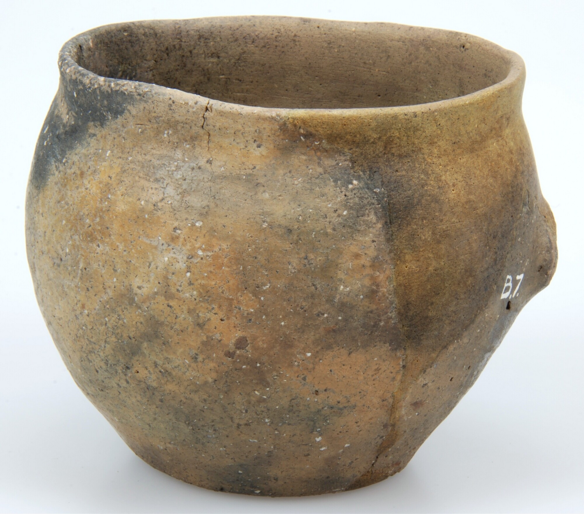 Urn; klein, bolvormig potje met restant knobbeloor op de buik; standvlak; fijne steengruis magering; crematieresten niet meer aanwezig; bij vinden afgesloten door 9169-06 (Arentzen, 2007)